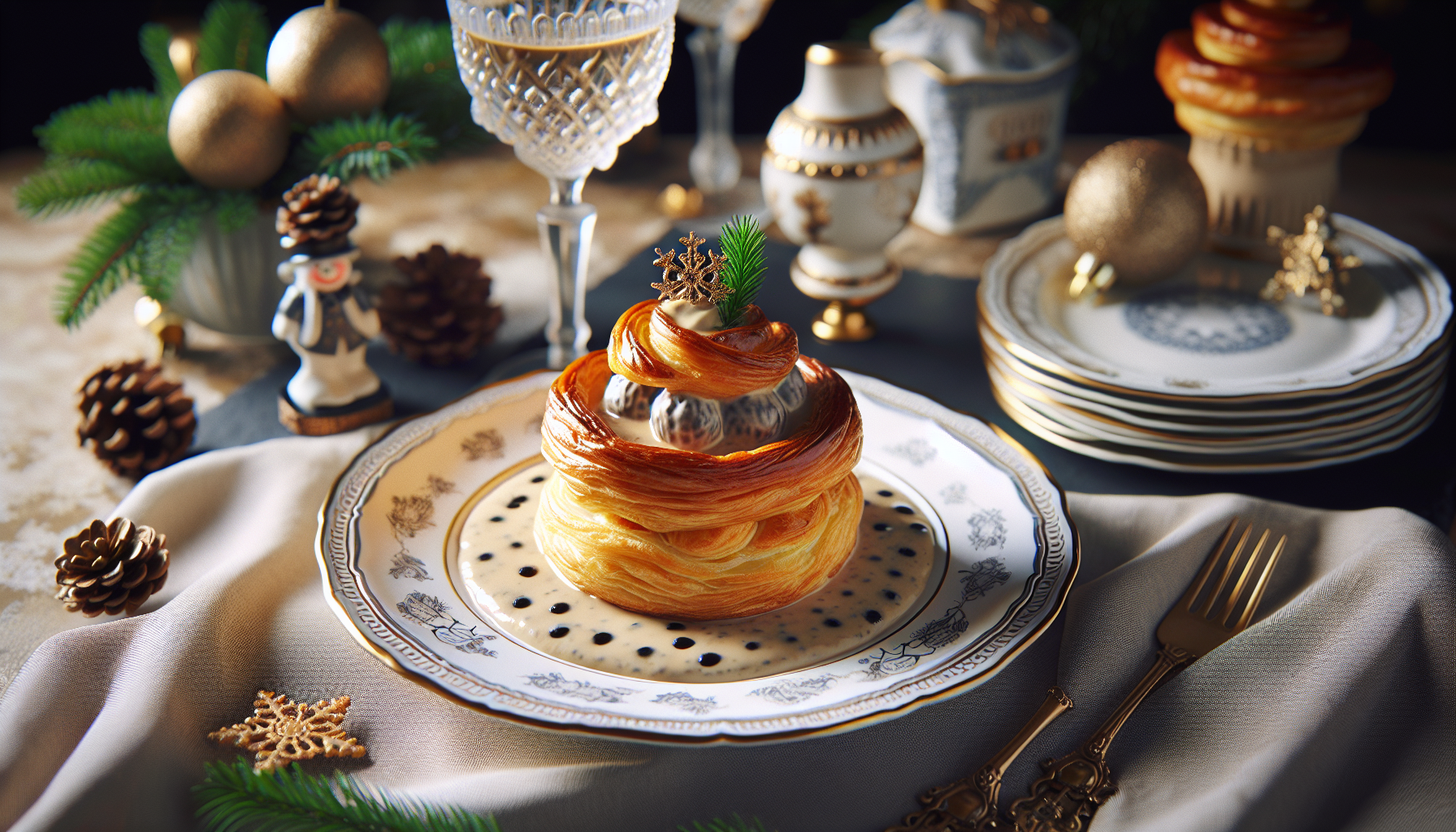 Pentru a prezenta vol-au-venturile cu cremă de ciuperci într-un mod atrăgător, alegeți o farfurie mare și faină. Așezați cu grijă vol-au-venturile coapte în fiecare colț al farfuriei. Pentru o notă de eleganță, adăugați câteva frunze de pătrunjel proaspăt pe lateral și câteva feliuțe subțiri de lămâie sau portocală pentru un contrast de culoare. Luați în considerare să strecurați câteva rămurele de cimbru sau rozmarin între vol-au-venturi, pentru un aspect rustic și natural. În jurul farfuriei, puteți așeza câteva boabe de piper roz sau măsline negre, adăugând astfel un accent suplimentar la plating-ul dvs. Creativ și elegant, vol-au-venturile servite vor fi cu adevărat un punct de atracție pe masa de Revelion.