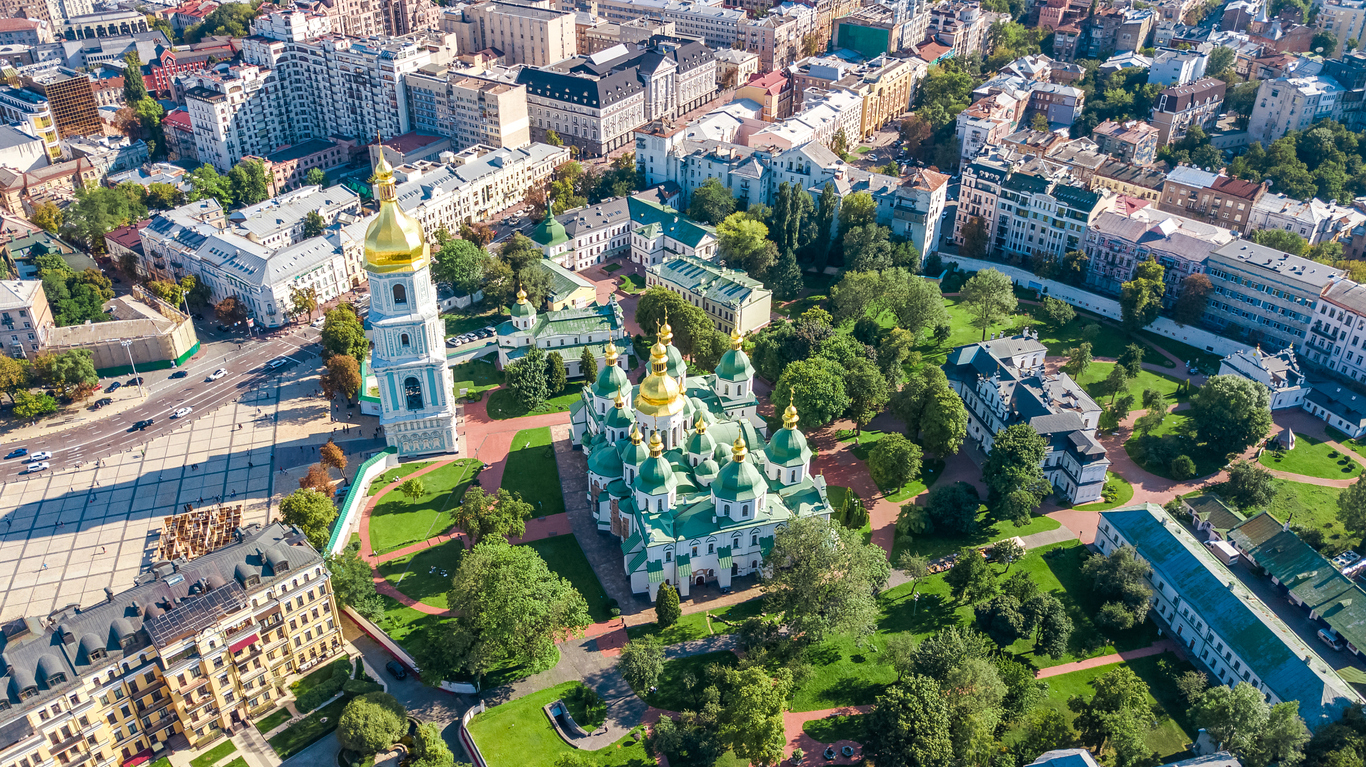 Foto: Vedere aeriană de sus a catedralei Sf. Sofia și a orizontului orașului Kiev de sus, peisajul orașului Kiev, capitala Ucrainei