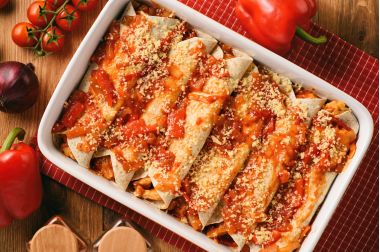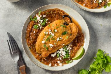Enchiladas: Enchiladas sunt tortilie umplute cu carne, brânză sau legume, acoperite cu sos de chili roșu sau verde și coapte în cuptor.