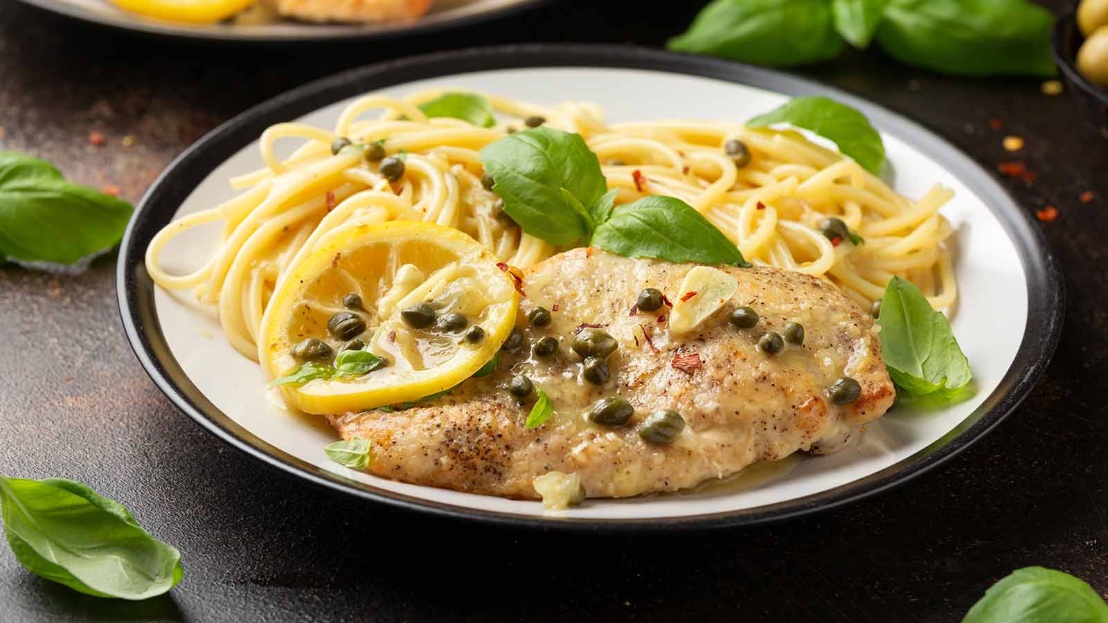 Bucurați-vă de delicioasa piccata cu pui capere, sos de vin alb și spaghete!