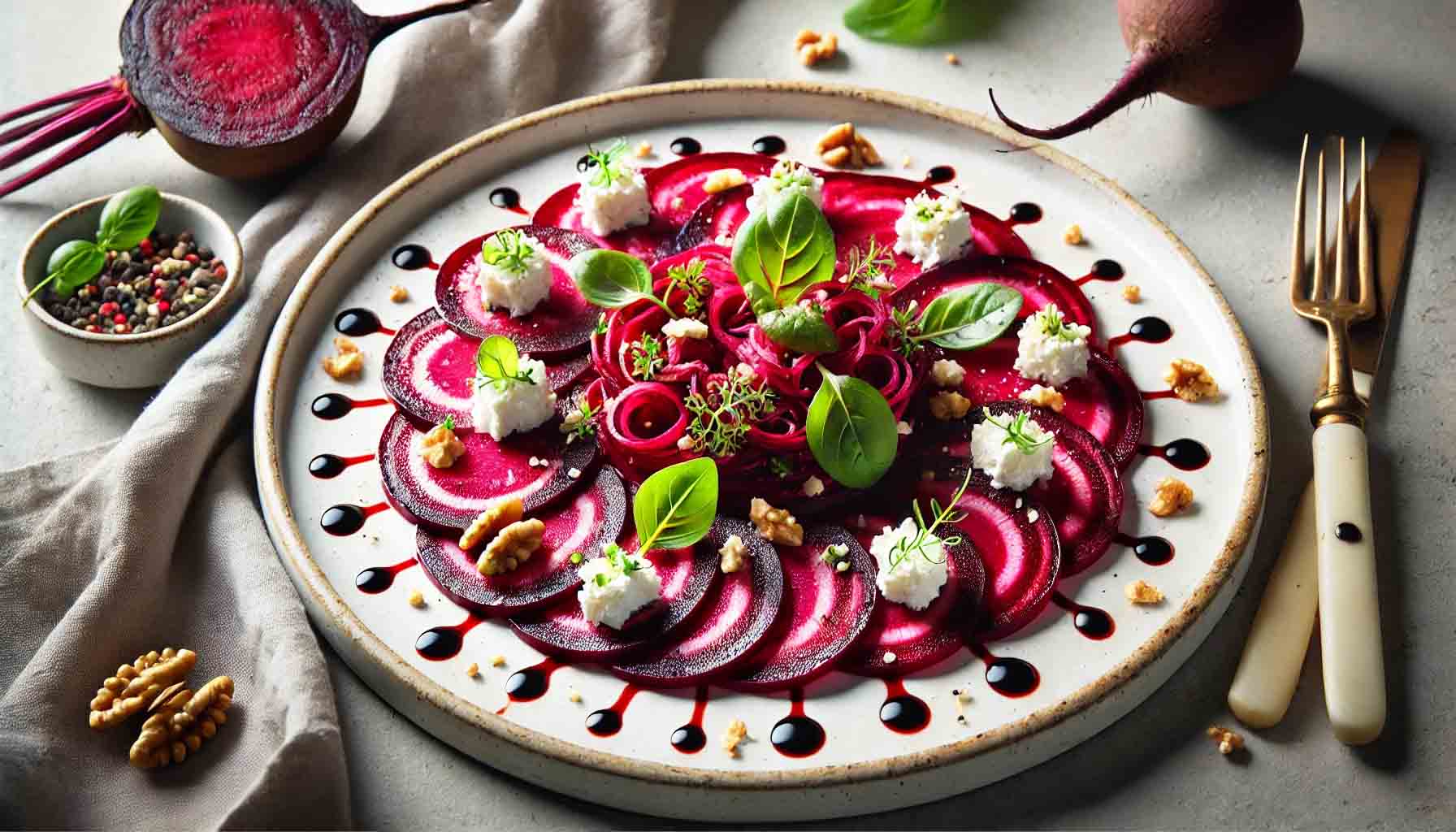 Carpaccio de sfeclă cu brânză de capră este un preparat elegant, care combină textura crocantă a sfeclei cu cremozitatea brânzei de capră. Este un aperitiv perfect pentru mese festive sau o opțiune sănătoasă pentru o cină ușoară.