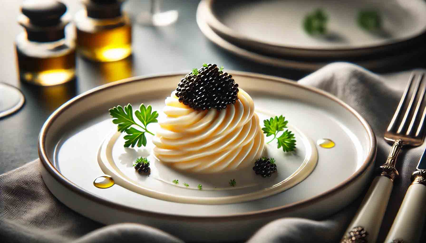 Piureul de conopidă este o alternativă elegantă și ușor de preparat la piureul tradițional de cartofi. Are o textură cremoasă și un gust delicat, care se potrivește perfect cu intensitatea caviarului. Preparatul de conopidă este adesea îmbunătățit cu unt, smântână sau ulei de măsline pentru a adăuga bogăție și aromă.