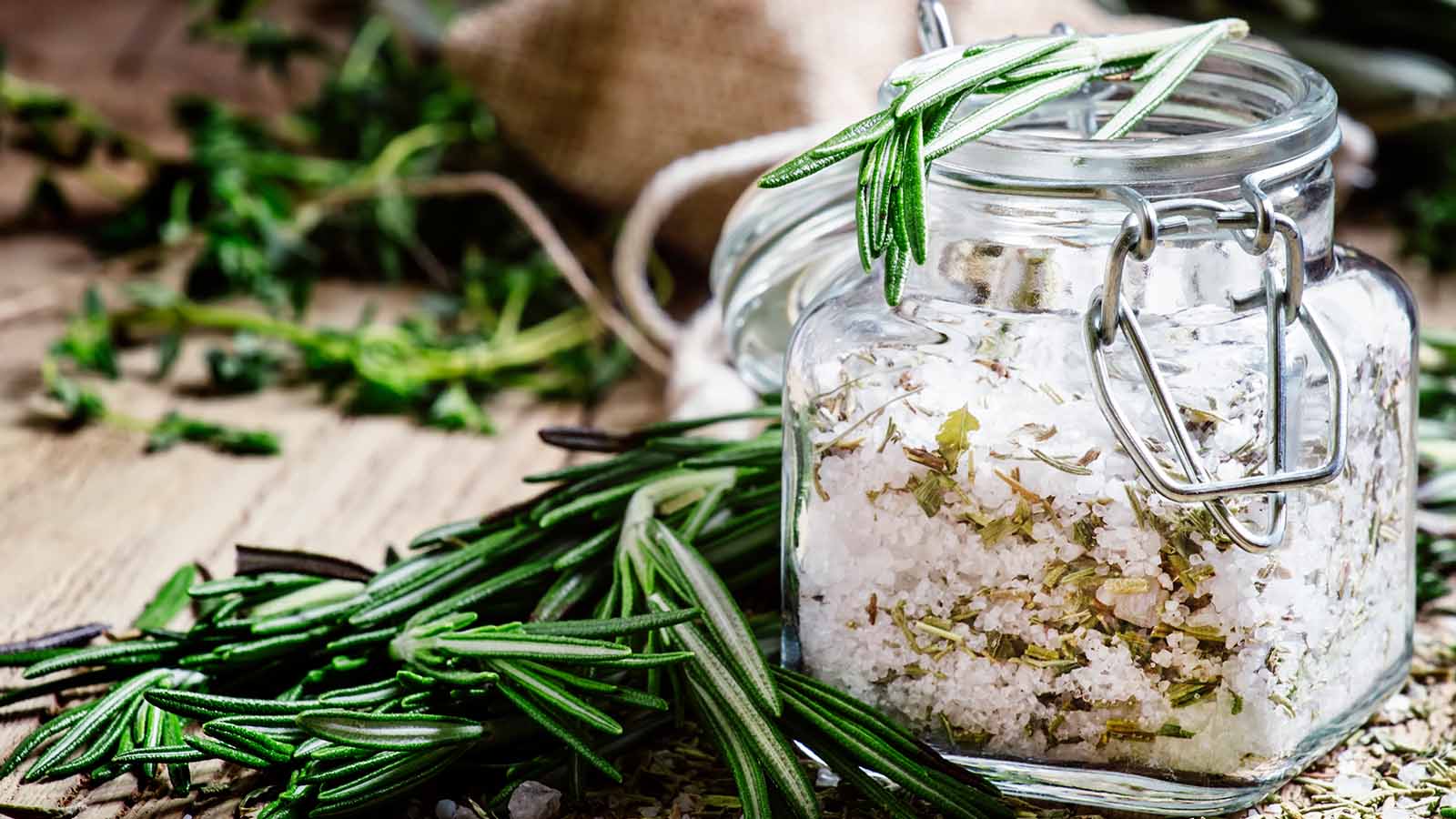 Adună ingrediente: ai nevoie de sare de mare și rozmarin uscat. Poți folosi rozmarin proaspăt, dar va trebui să îl usuci în prealabil.