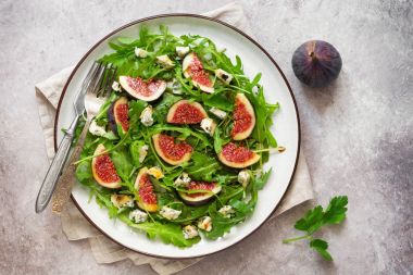 Salată cu smochine: Poți face o salată delicioasă și sănătoasă amestecând smochine tăiate în sferturi cu frunze de salată verde, nuci sau migdale, brânză de capră sau brânză feta și un dressing de miere și oțet balsamic.