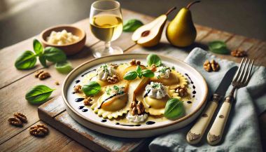 • Ravioli umpluți cu piure de pere, serviți cu un sos decadent de brânză gorgonzola și nuci prăjite.