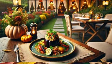 • Vinete coapte, umplute cu o combinație de quinoa, legume și condimente, alături de un sos de tahini aromat.