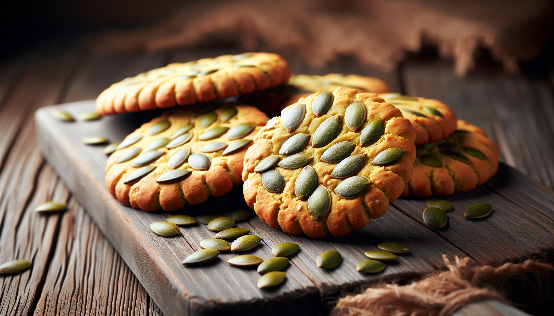 Biscuiții cu semințe de dovleac sunt perfecti pentru desert sau ca gustare între mese. Mixați unt, zahăr, esență de vanilie, adăugați făină, bicarbonat de sodiu și semințe de dovleac. Formați biscuiții și coaceți-i într-un cuptor preîncălzit până devin aurii și crocanți.