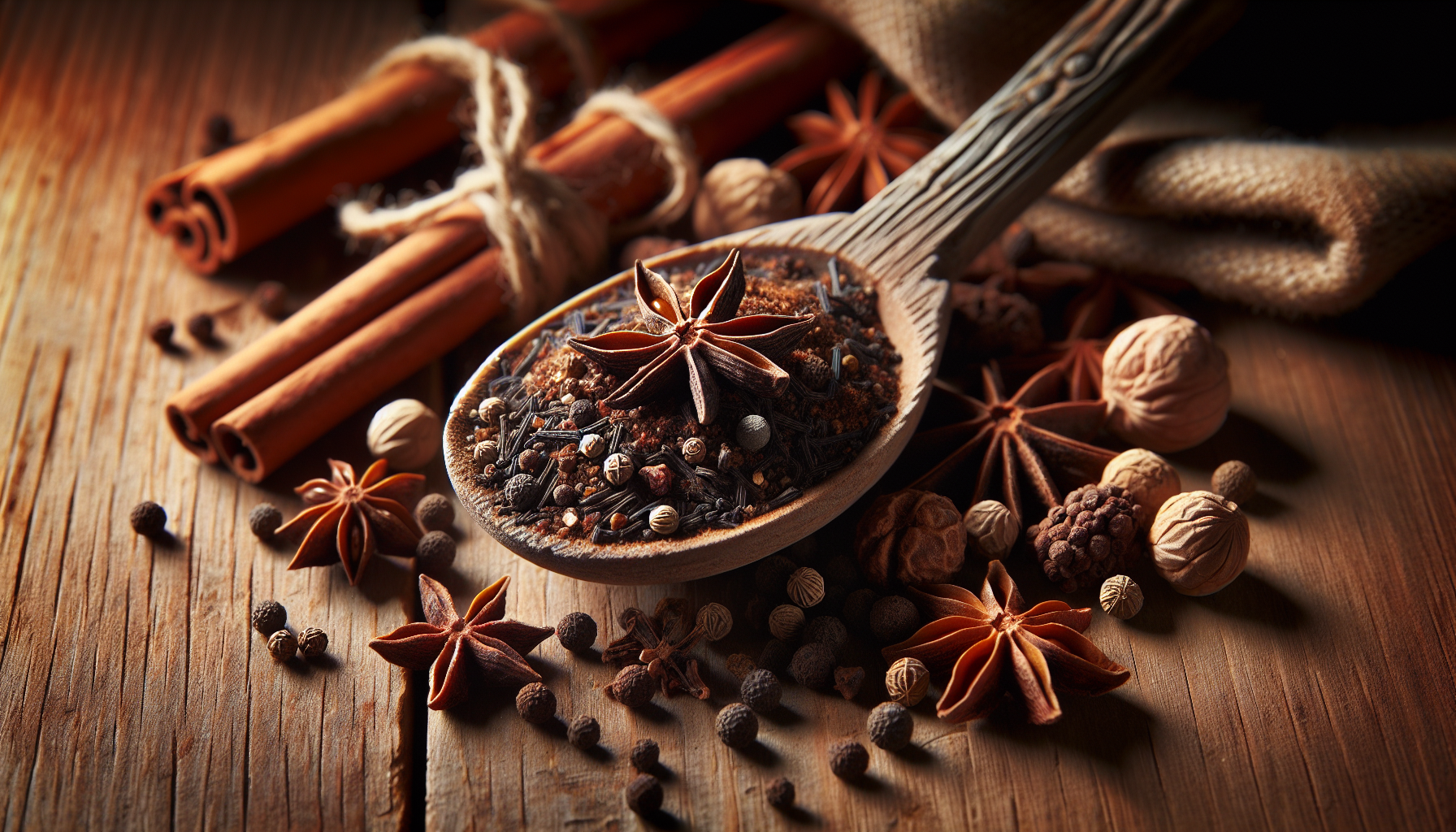 Amestecul de cinci condimente chinezești este o combinație de arome puternice și bine echilibrate, care aduc o complexitate aparte oricărui preparat. Principalele componente sunt anasonul stelat, cuișoarele, scorțișoara, semințele de fenicul și piperul Sichuan. Fiecare dintre acestea contribuie cu propria sa notă distinctă: anasonul stelat oferă o dulceață subtilă, cuișoarele dau o notă caldă și dulceagă, scorțișoara adaugă un gust iute-picant, semințele de fenicul emană o aromă dulce și ușor de lemn dulce, iar piperul Sichuan își aduce aportul cu o ușoară tentă piperată și o senzație anestezică pe limbă.