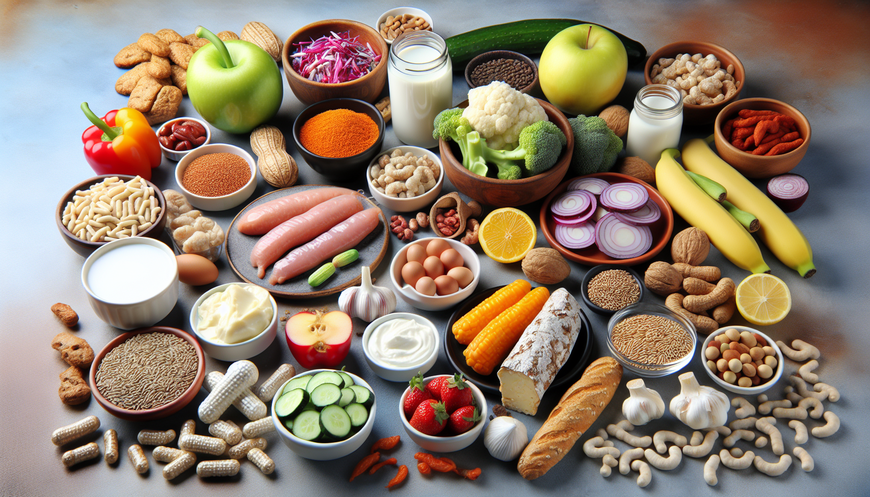 O varietate de alimente sunt recunoscute pentru conținutul lor bogat în probiotice, oferind o sursă naturală și gustoasă de microorganisme benefice. Iaurtul și kefirul sunt două dintre cele mai populare produse lactate fermentate, cu un conținut ridicat de lactobacili. Varza murată și kimchi, ambele preparate prin fermentație, aduc un aport semnificativ de probiotice și sunt esențiale în bucătăriile tradiționale din diverse culturi. Miso și tempeh sunt alte surse importante de probiotice, frecvent utilizate în alimentația asiatică. În plus, băuturi precum kombucha devin din ce în ce mai populare pentru beneficiile lor probiotice.