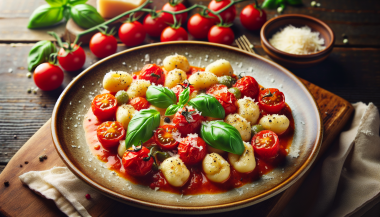 Descrierea Retetei Gnocchi cu sos de roșii cherry și busuioc reprezintă o rețetă clasică italiană, reconfortantă și aromată, perfectă pentru un prânz sau o cină îmbelșugată. Combinația de gnocchi pufosi cu roșii cherry zemoase și busuioc proaspăt oferă o explozie de gusturi, transformând acest fel de mâncare într-o opțiune adorată de toate vârstele....