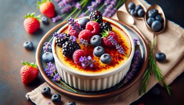 Descriere Creme brulee cu lavandă și fructe de pădure reprezintă o combinație elegantă și parfumată, ideală pentru un desert de vară rafinat. Lavanda adaugă o notă distinctă și aromată, în timp ce fructele de pădure, cu dulceața și aciditatea lor, echilibrează cremozitatea bogată a cremei brulee. Acest desert nu numai că este delicios, dar și vizual...