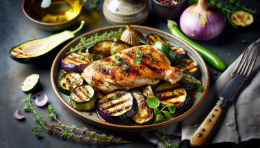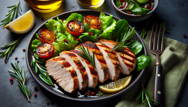 Descriere Grătarul de curcan cu rozmarin este o rețetă sănătoasă și savuroasă, perfectă pentru orice zi a săptămânii. Această mâncare îmbină carnea suculentă de curcan cu aroma intensă a rozmarinului și este completată de o salată verde proaspătă și crocantă. Rețeta este simplă, dar rezultatul este o masă plină de gust și texturi plăcute. O opțiune...