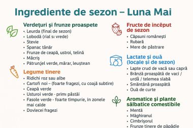 Ingrediente de sezon – Luna Mai Verdețuri și frunze proaspete Leurda (final de sezon) Lobodă (roșie și verde) Ștevie Spanac tânăr Salată verde crocantă Frunze de ceapă, usturoi, țelină Măcriș Pătrunjel verde, mărar, leuștean Legume tinere Ridichi roz sau...