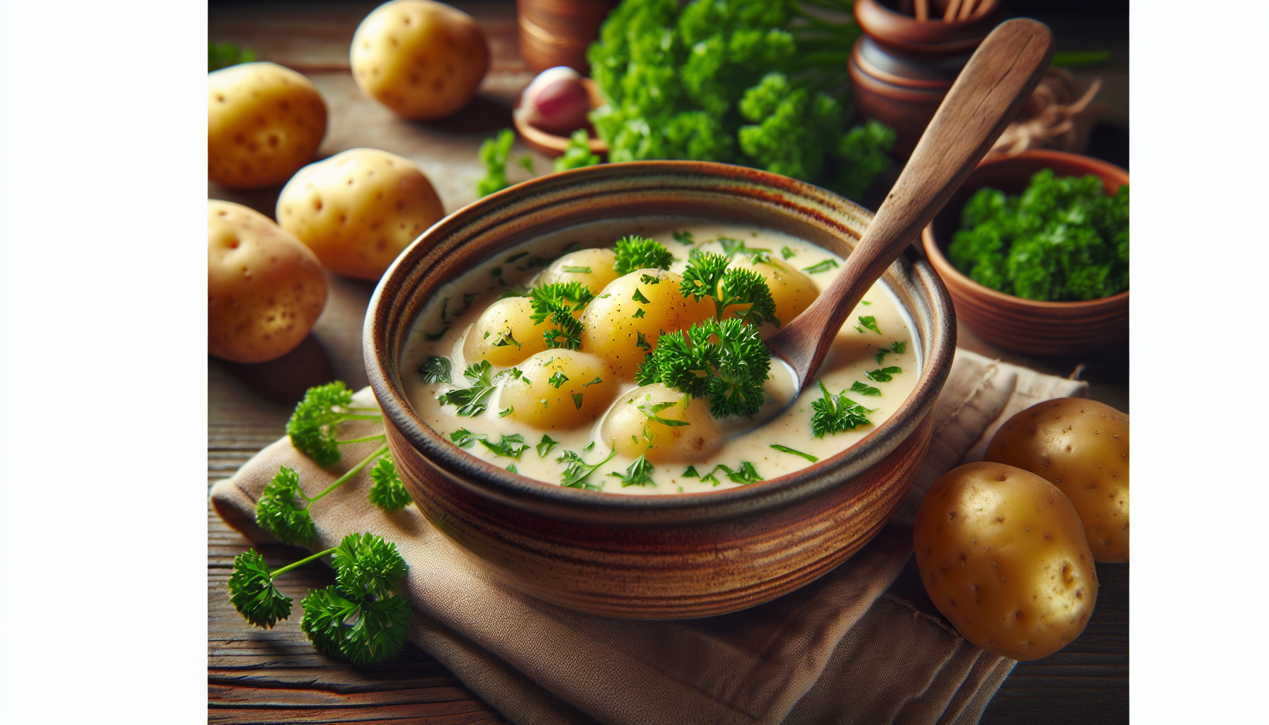 - 1 kg de cartofi noi, curățați și tăiați cuburi - 1 legătură mare de pătrunjel, tocată - 2 cepe medii, tocate - 3 căței de usturoi, mărunțiți - 2 litri de supă de legume sau apă - 100 ml smântână pentru gătit - 2 linguri de ulei de măsline - Sare și piper după gust - Opțional: crutoane sau pâine prăjită pentru servire Alternativă vegană: Înlocuiește smântâna pentru gătit cu o variantă vegană sau folosește lapte de cocos pentru o textură cremoasă. Instrucțiuni pas cu pas