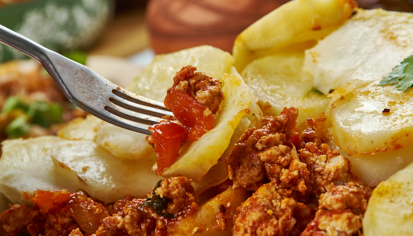 Straturi Armonioase: Într-o tavă termorezistentă, alternează straturile de vinete, cartofi și umplutura de carne. Asigură-te că fiecare strat este uniform distribuit.
