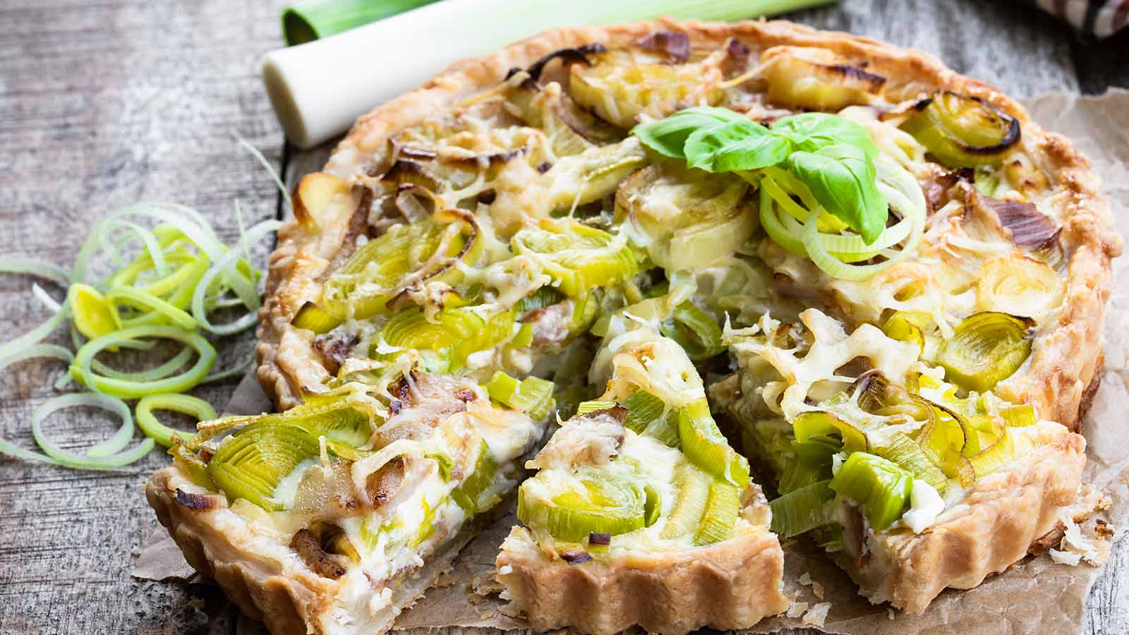 Iată o rețetă delicioasă pentru tartă cu praz, slănină și brânză: