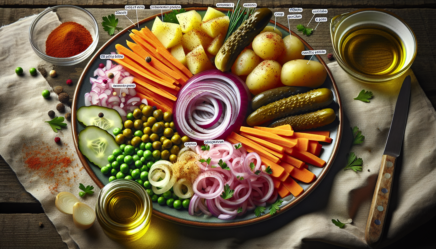 Într-un bol mare, adăugați cartofii, morcovii, ceapa roșie tăiată julienne, castraveții murați tăiați felii și mazărea. Turnați dressingul pregătit peste legume și amestecați ușor până când toate ingredientele sunt bine încorporate. Ajustați de sare și piper dacă este necesar.