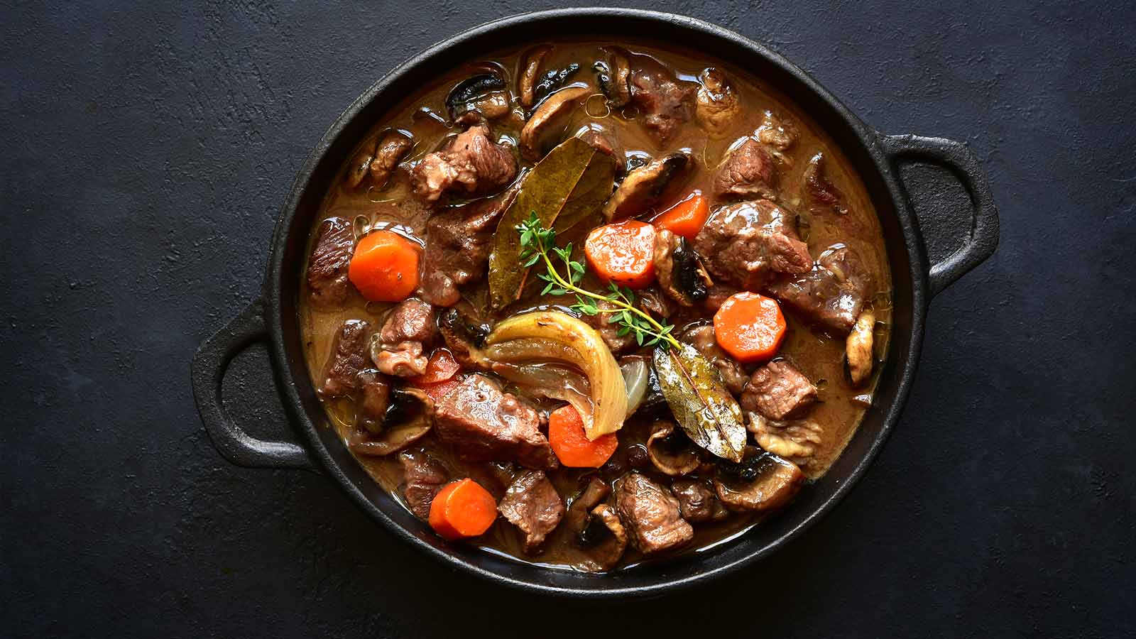 Carne de vită bourguignon este o rețetă tradițională franceză de tocană de carne cu legume și ciuperci, gătită în vin roșu, de obicei într-o tigaie de fontă.