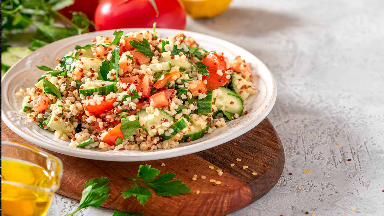 Serveste salata Tabbouleh cu bulgur si quinoa proaspata si potrivita pentru o masa delicioasa si hranitoare.