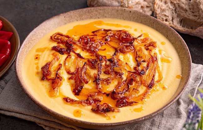 Ajustarea gustului: Gustați fasolea bătută și ajustați condimentele și consistența după preferință. Puneti deasupra sosul de ceapa prajita.