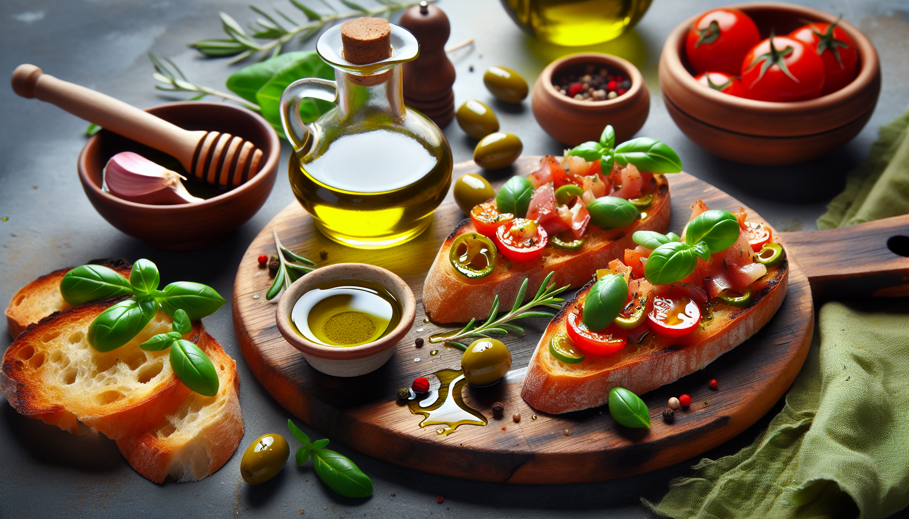 Bruschetta cu ulei de măsline este un preparat culinar cu o istorie bogată și o versatilitate incredibilă. Acest fel de mâncare, deși simplu la prima vedere, oferă multiple variații și arome care pot satisface și cele mai pretențioase gusturi. Componenta principală, pâinea prăjită, servește ca un fundal perfect pentru bogăția de arome pe care o oferă uleiul de măsline extravirgin, acompaniat frecvent de roșii proaspete, usturoi, busuioc și alte ingrediente opționale. Prin combinarea acestor elemente, bruschetta nu doar că amplifică gusturile tradiționale mediteraneene, dar devine și un simbol al ospitalității și convivialității italiene.