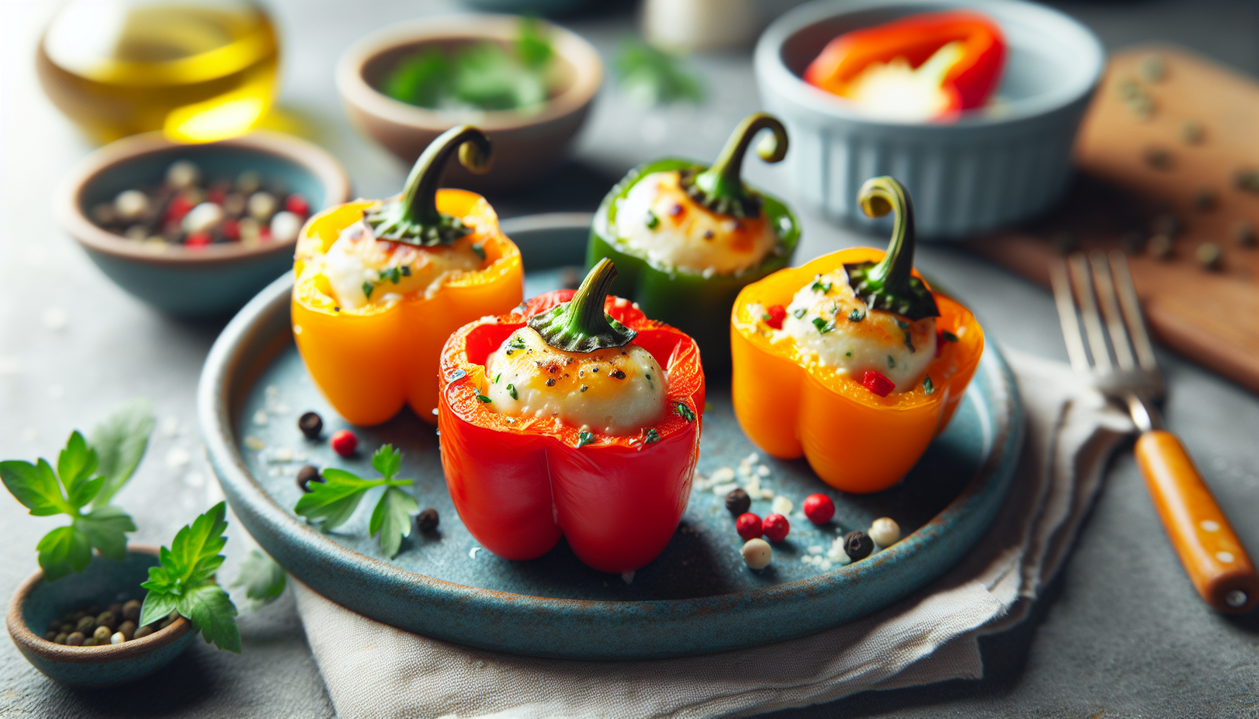 Mini ardeii, cunoscuți și sub numele de ardei dulci, sunt varietăți mici și colorate, oferind nu doar un aspect atrăgător, ci și un gust delicat. Aceste legume sunt lipsite de iuțeala tipică a altor soiuri de ardei, ceea ce le face ideale pentru a fi umplute cu diverse amestecuri delicioase. În combinație cu brânză și ierburi proaspete, mini ardeii devin un preparat sofisticat și potrivit pentru diverse preferințe culinare. Brânza utilizată, care poate varia de la feta la brânză de capră sau cremă de brânză, adaugă o notă cremoasă și bogată, în timp ce ierburile proaspete precum busuiocul, mărarul și pătrunjelul potențează savoarea.