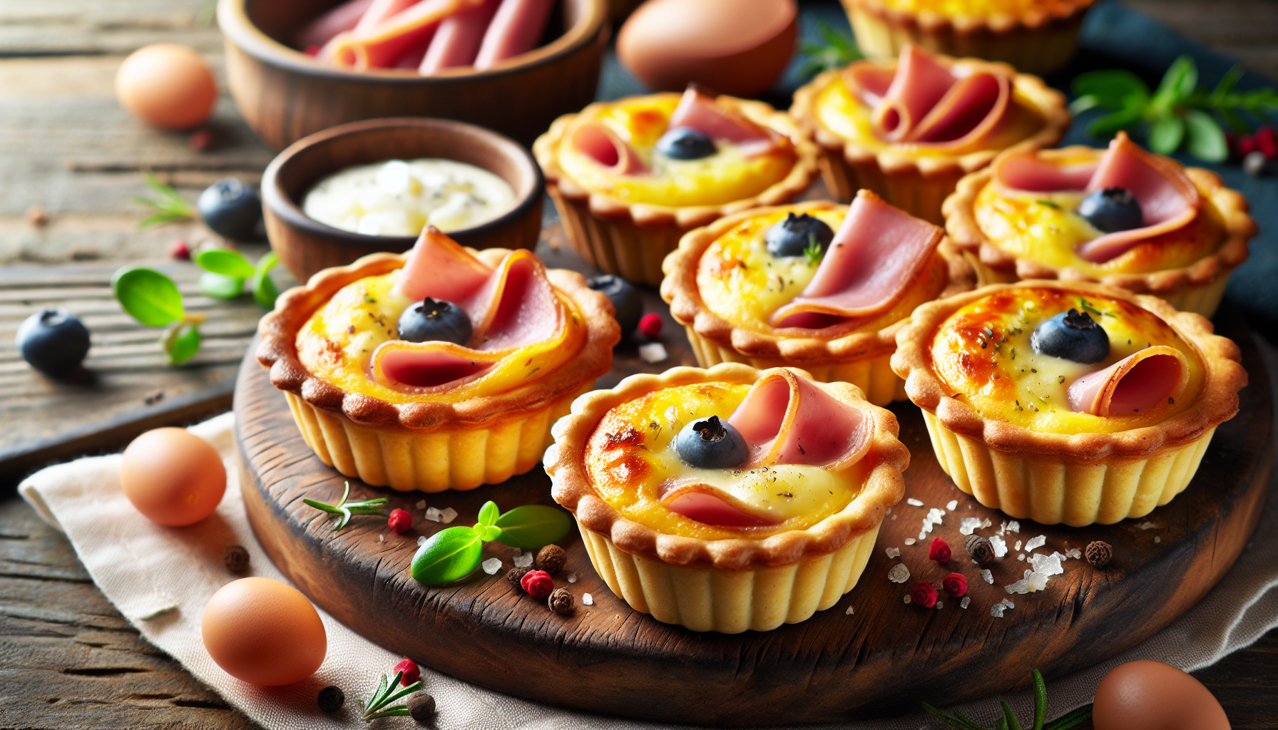 Mini quiche-urile cu șuncă și brânză sunt preparate dintr-un aluat subțire și crocant, umplut cu un amestec savuros de ouă, lapte, șuncă afumată și brânză topită. Această combinație simplă, dar de efect, reușește să îmbine armonios texturi și arome, oferind o explozie de savoare la fiecare mușcătură. Fiecare mini quiche este un mic univers culinar, în care simplitatea ingredientelor se întâlnește cu complexitatea aromelor, răsfățând papilele gustative cu un gust inconfundabil.