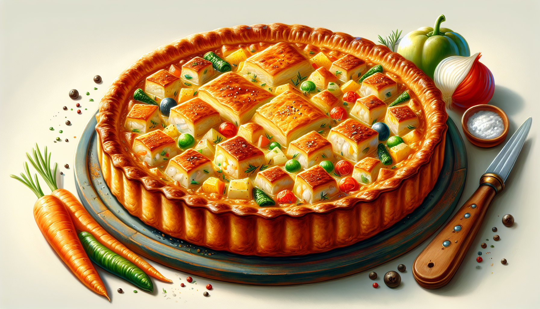 Pentru a pregăti o plăcintă savuroasă cu pește și legume, veți avea nevoie de următoarele ingrediente: 500 de grame de file de pește alb (cod, merluciu sau alt pește), 200 de grame de amestec de legume congelate (mazăre, morcov, porumb), 1 ceapă mare, 3 căței de usturoi, 250 ml de smântână pentru gătit, 1 lingură de făină, 50 de grame de unt, sare, piper, pătrunjel proaspăt, 1 pachet de aluat foietaj.
