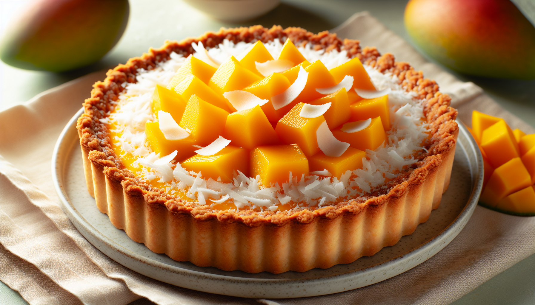 Tarta cu mango și cocos este un desert luminos și plin de savoare, care îmbină textura cremoasă a fructului de mango cu crocanta nucă de cocos răzuită. Crusta de tarte se prepară dintr-o bază crocantă de biscuiți cu unt, care este apoi umplută cu un strat generos de cremă de mango și încoronată cu un strat generos de fulgi de cocos prăjiți. Este un desert răcoritor și foarte potrivit pentru petrecerile de vară sau ca un final elegant pentru o masă în familie ori cu prietenii.