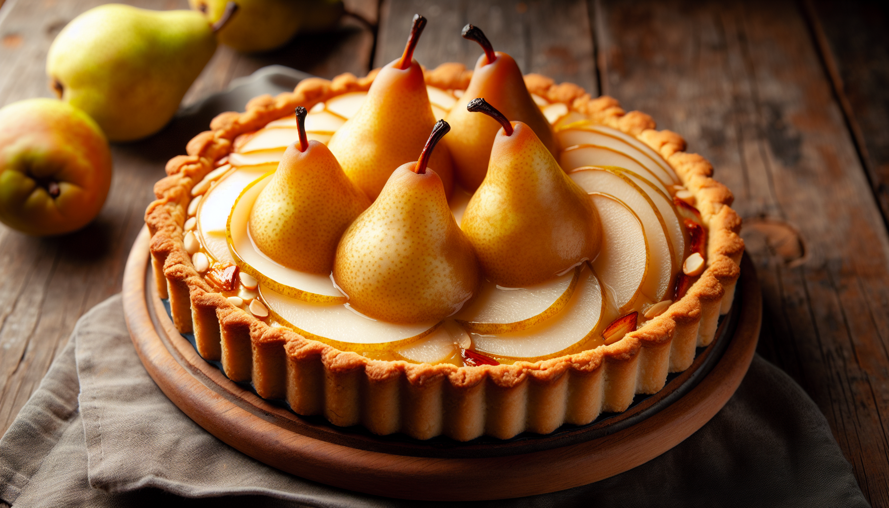 Pentru a prepara blatul, amestecați migdalele măcinate cu făina, untul, zahărul și sarea. Frământați combinația până obțineți un aluat omogen care se lasă presat în forma de tartă, creând o bază uniformă. Coaceți baza în cuptor la 180°C timp de 20 de minute sau până când începe să capete o nuanță aurie. Între timp, pregătiți umplutura tăind perele felii și amestecând într-o cratiță la foc mediu zahărul cu apa, până când se obține un sirop. Adăugați felii de pere și lăsați-le să se pocheze ușor. Separat, bateți ouăle cu smântâna și vanilia, apoi încorporați migdalele feliate.