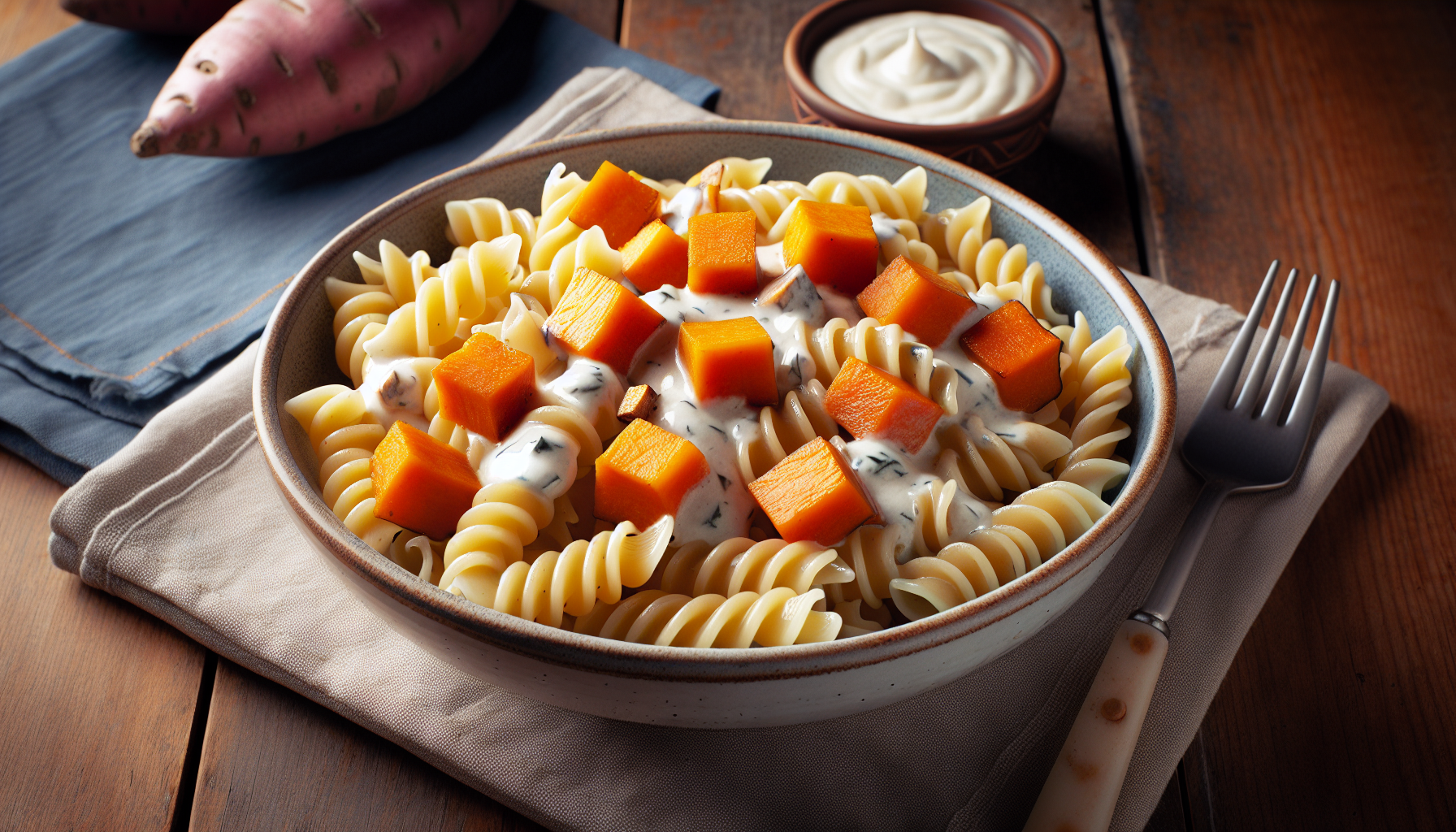 Pastele cu sos alb și cuburi de cartofi dulci nu numai că încântă papilele gustative, dar sunt şi o alegere nutritivă excelentă. Cartofii dulci sunt o sursă bogată de vitamine, în timp ce pastele, ales corect, pot oferi energia necesară pentru o zi plină. Împreună, aceste ingrediente creează un echilibru între carbohidrați, proteine și grăsimi. Această rețetă este un exemplu perfect de cum gustul divin poate merge mână în mână cu alimentaţia sănătoasă.