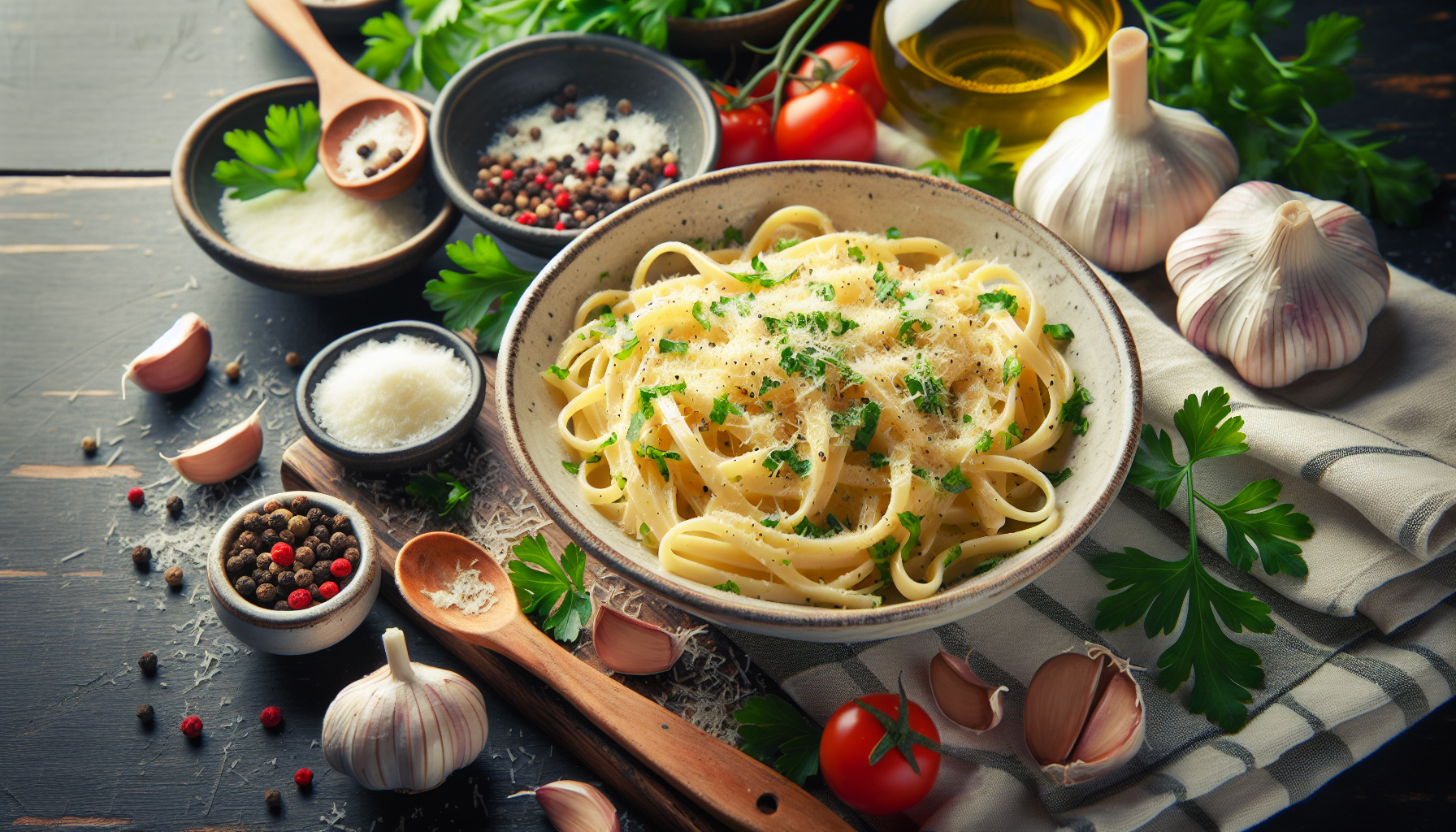 Seleția ingredientelor este crucială pentru a asigura succesul acestei rețete. Pastele trebuie să fie de înaltă calitate, de preferat din grâu dur, pentru a rezista bine la fierbere și a absorbi sosul eficient. Parmezanul ar trebui să fie autentic, preferabil Parmigiano Reggiano, pentru că oferă acel gust bogat și nuanțat, specific. Usturoiul trebuie să fie proaspăt, deoarece usturoiul vechi poate deveni amărui și poate domina prea mult sosul. Pătrunjelul, de asemenea, trebuie să fie proaspăt și vibrant, pentru a adăuga o notă de culoare și prospețime preparatului final.