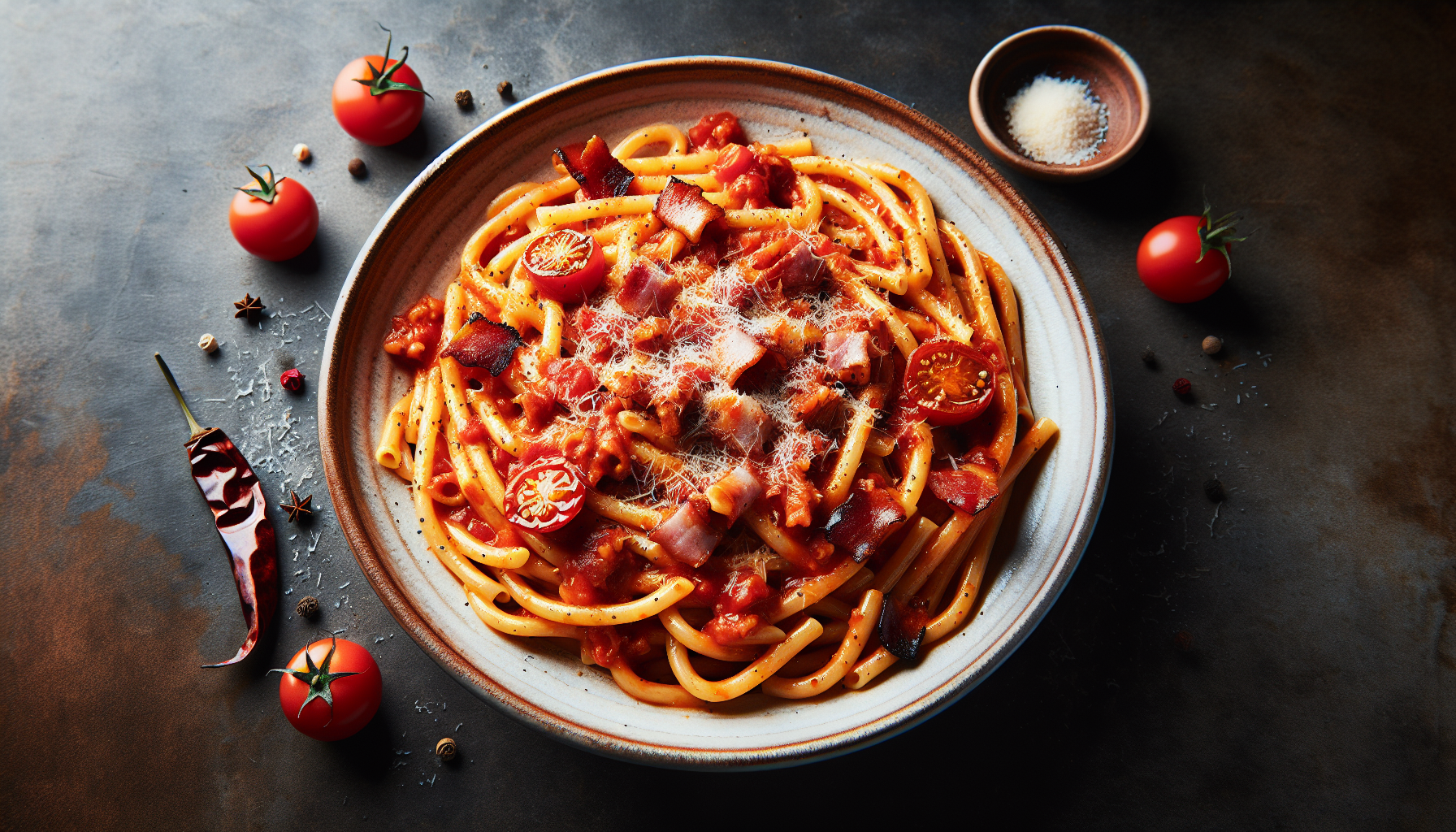 Bucatini sunt un tip de paste lungi și groase, asemănătoare cu spaghetti, dar cu un orificiu pe mijloc. Textura lor groasă și poroasă le face ideale pentru a absorbi sosurile bogate, cum ar fi Amatriciana. Sosul Amatriciana este făcut din pancetta afumată, roșii, piper roșu și, uneori, ceapă, creând un echilibru perfect între dulce și picant.