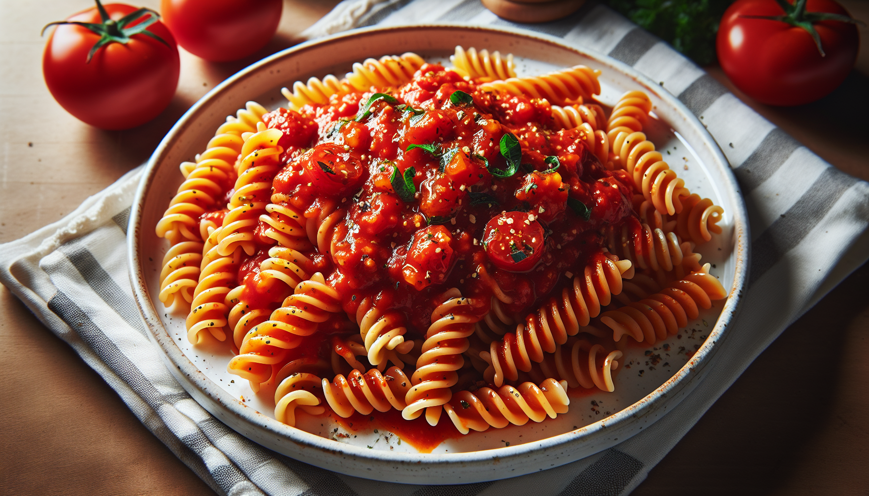 Pastele fusilli, cunoscute pentru forma lor spiralată, se combină excelent cu diverse tipuri de sosuri datorită capacitatii lor de a reține sosul între spiralele lor. Sosul marinara, un sos roșu tradițional italian preparat din roșii, usturoi, și ierburi aromate, este o opțiune excelentă pentru a însoți aceste paste datorită gustului său vibrant și reconfortant. Acest fel de mâncare este nu doar delicios, ci și ușor de preparat, fiind ideal pentru o cină rapidă în timpul săptămânii.