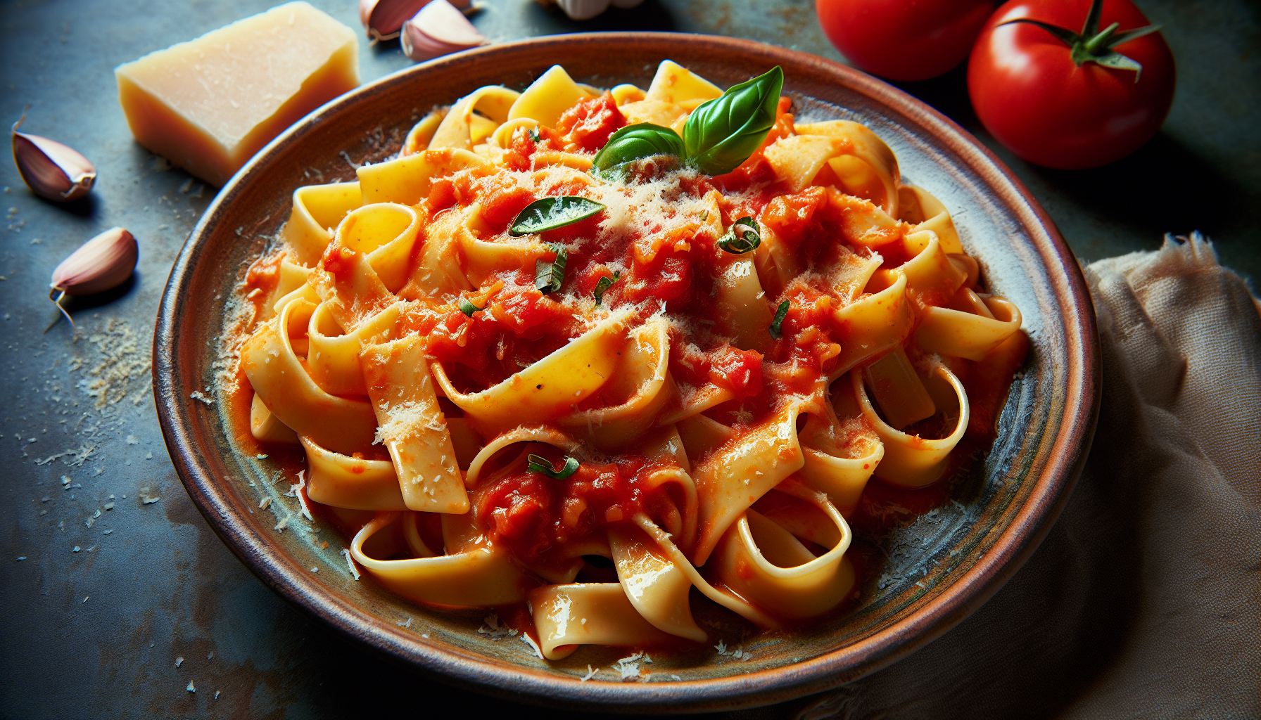 Pappardelle al Pomodoro este un clasic al bucătăriei italiene, care îşi are rădăcinile în simplitatea și puritatea ingredientelor folosite. Această rețetă transformă pastele obișnuite într-o experiență culinară de neuitat, punând în valoare armonia între pappardelle, sosul de roșii proaspete și usturoi. Acest fel de mâncare nu doar că satisface pofta de gusturi autentice, dar reușește și să aducă un omagiu tradiției italiene, unde fiecare ingredient este tratat cu respect și atenție.