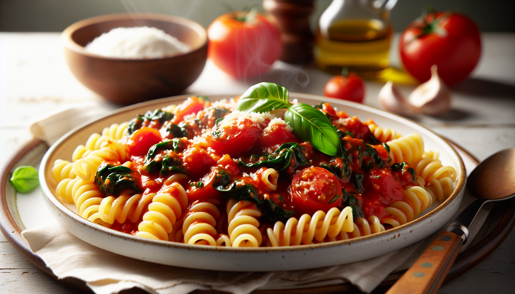 Pastele rotini sunt recunoscute pentru forma lor spiralată care captează perfect sosurile. Combinând aceste paste cu un sos de roșii bogat și frunze de spanac proaspăt, se creează un echilibru perfect între simplu și gustos. Sosul de roșii adaugă o notă robustă și ușor acidulată, în timp ce spanacul introduce o textură moale și o culoare vibrantă, îmbogățind preparatul cu fier și vitamine esențiale.