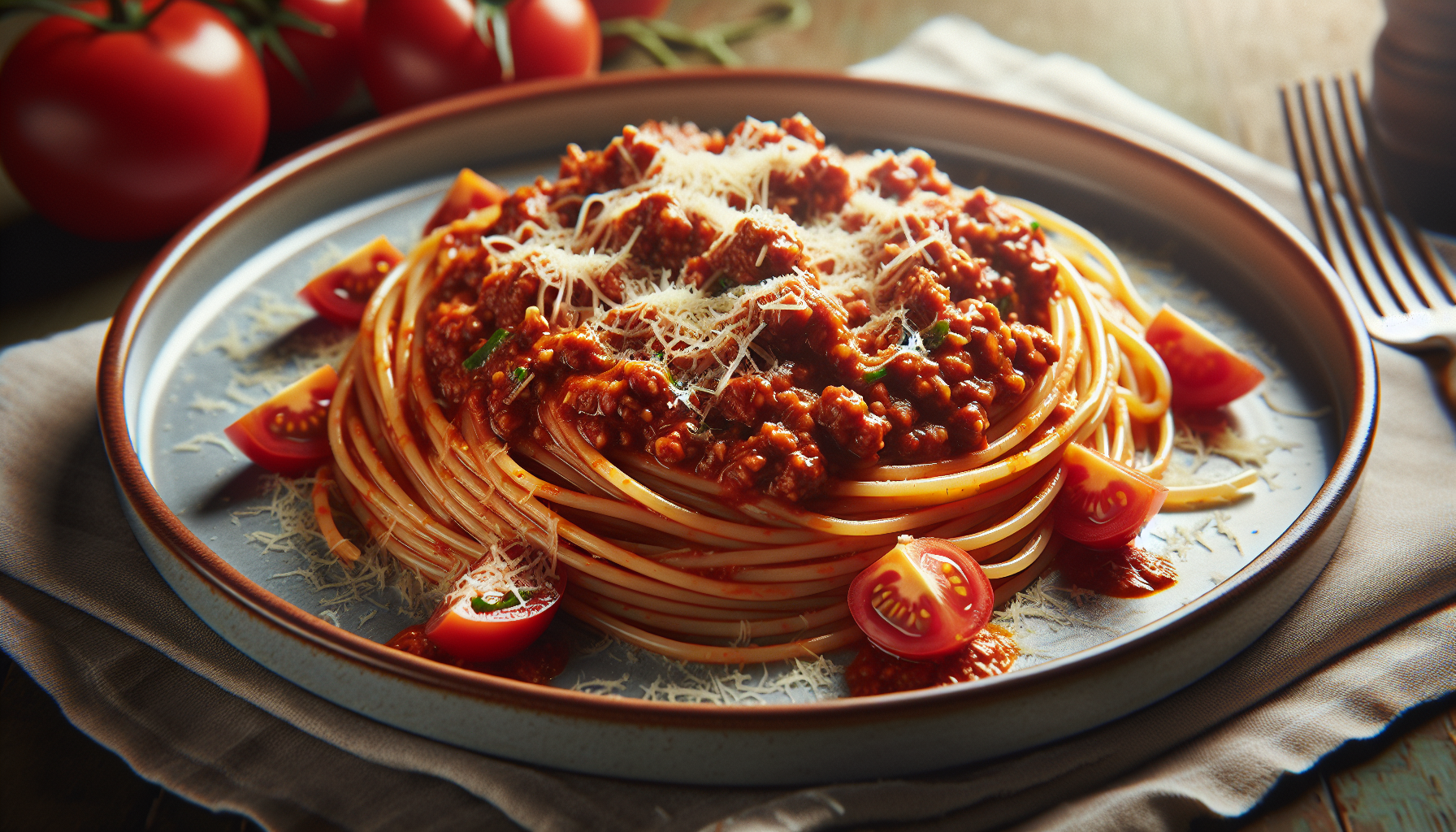 Spaghetti Bolognese este un preparat ce combină simplitatea cu gustul intens. Sosul bolognese este realizat din carne de vită tocată, care este încorporată într-un amestec de legume aromate, cum ar fi ceapa, morcovii și țelina, gătite lent împreună cu roșii și diverse condimente. Pastele, de obicei spaghetti, sunt fierte până ating perfect textura "al dente" și sunt apoi amestecate cu sosul bogat, fiind servite frecvent cu Parmesan ras și ierburi proaspete. Acest fel de mâncare nu numai că satisface foamea, dar și încântă simțurile cu fiecare îmbucătură.