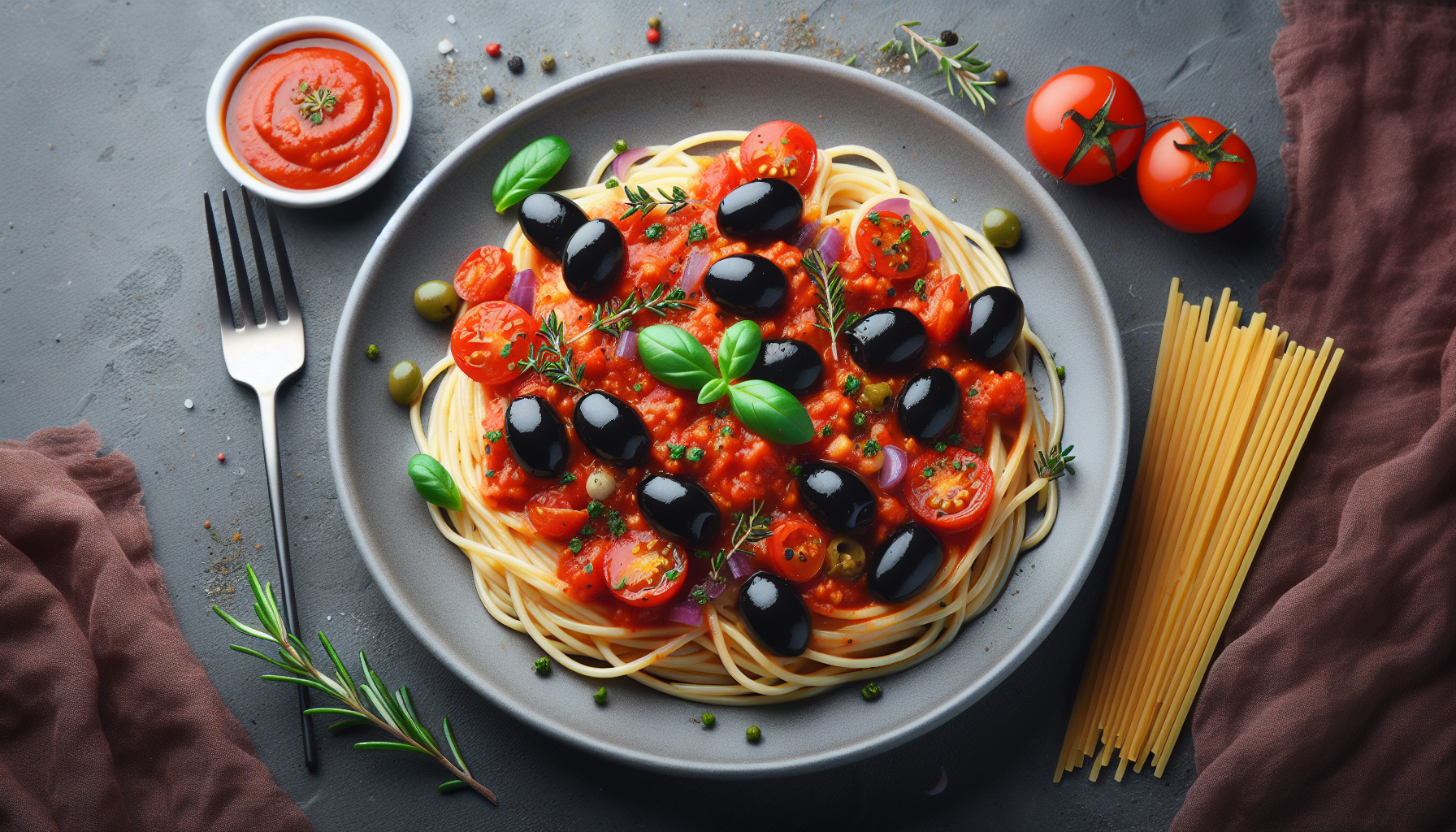 Alegerea ingredientelor este crucială pentru succesul acestei rețete. Roșiile trebuie să fie bine coapte și zemoase, de preferat varietăți precum San Marzano sau Roma, cunoscute pentru calitățile lor superioare în preparatele culinare. Măslinele negre ar trebui să fie de bună calitate, ideal fără aditivi sau conservanți inutili. Usturoiul și ceapa trebuie să fie proaspete pentru a asigura maximum de aromă, iar uleiul de măsline extravirgin să aibă o aromă placută și un gust fructat.