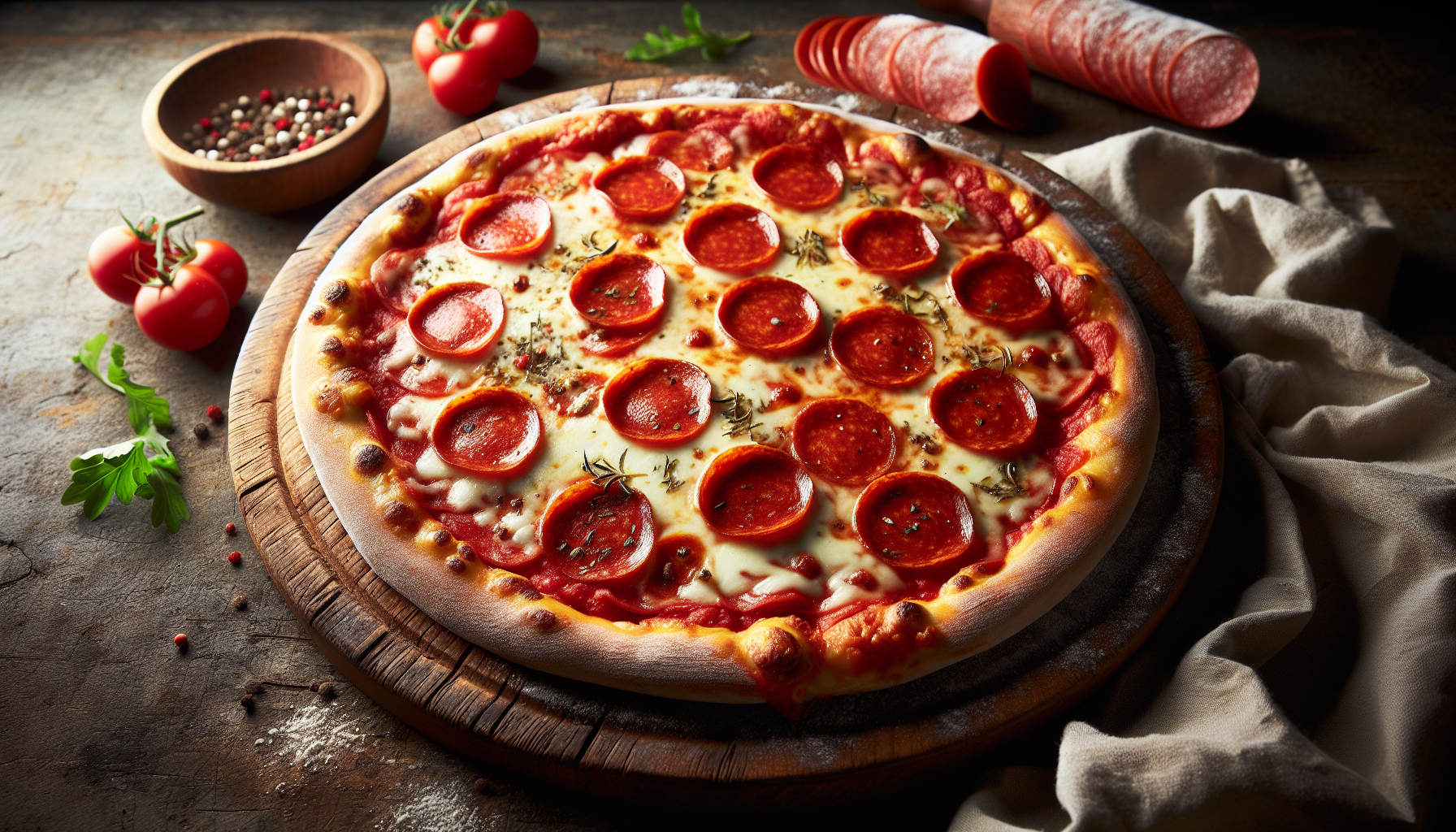 Pizza pepperoni este un spectacol culinar, unde fiecare mușcătură oferă un echilibru perfect între dulceața sosului de roșii, textura bogată și cremoasă a mozzarelei, și picăntura distinctivă a feliatelor de pepperoni. Aceasta combinație de arome și texturi face din pizza pepperoni o alegere predilectă a gurmanzilor peste tot în lume.