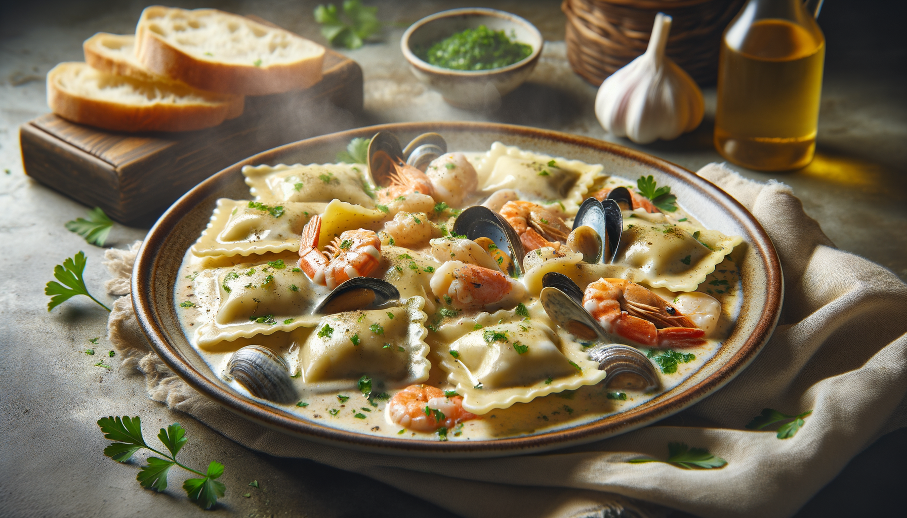 Ravioli cu pește și fructe de mare într-un sos cremos de smântână constituie o alegere culinară sofisticată, perfectă pentru ocazii speciale sau pentru un prânz sau cină rafinată. Acest fel de mâncare combină textura delicată și aroma bogată a fructelor de mare cu cremozitatea sosului de smântână, creând un echilibru perfect între ingrediente și gusturi.