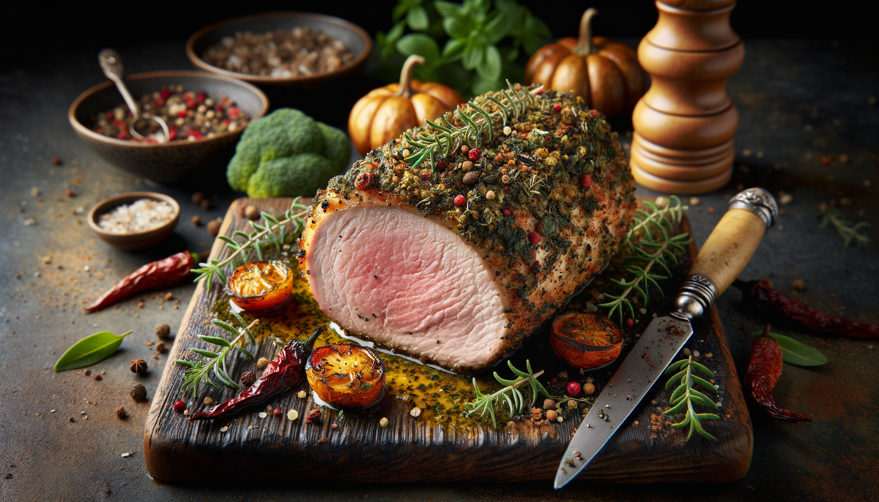 Ierburile proaspete utilizate în crustă, precum rozmarinul, cimbrul și pătrunjelul, oferă un profil aromatic care complimentează perfect mușchiulețul de porc. De asemenea, usturoiul și lămâia adaugă un accent de prospețime, echilibrând gustul bogat al cărnii. Gătirea la cuptor oferă mușchiulețului o crustă crocantă, în timp ce interiorul rămâne fraged și suculent.