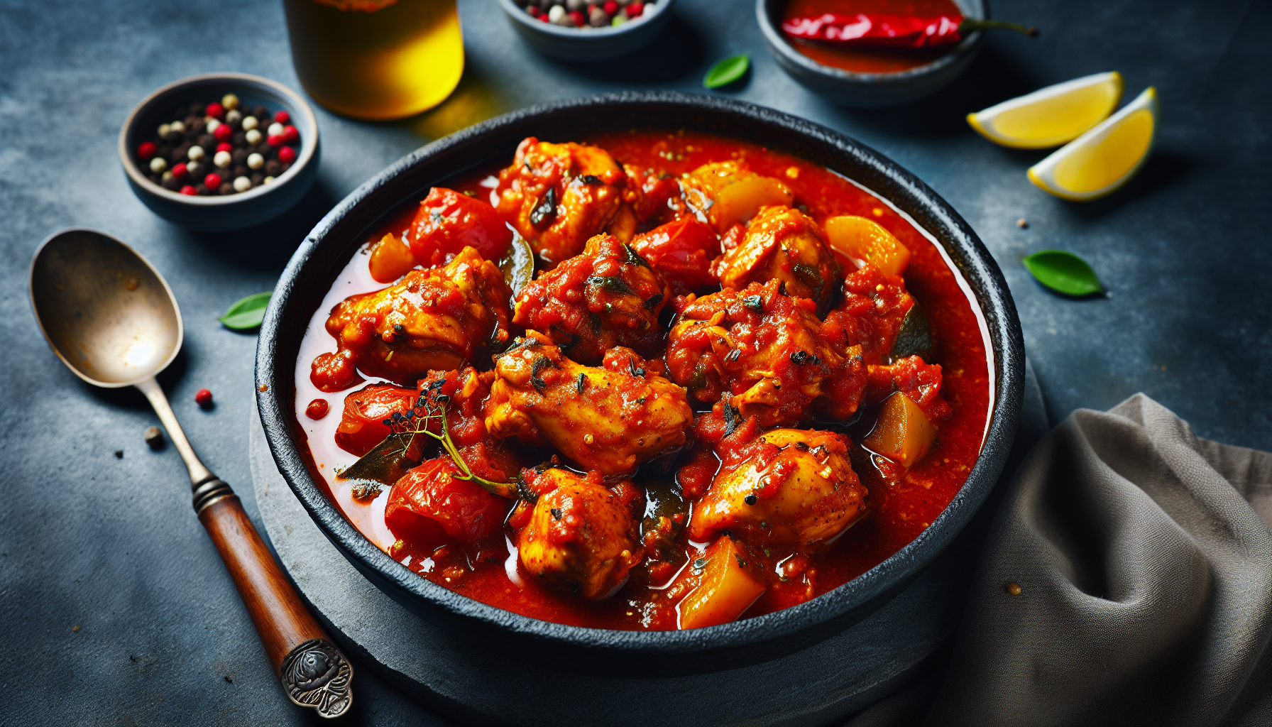 Începeți prin a încinge uleiul într-o cratiță mare la foc mediu. Adăugați ceapa tocată și sotați până devine translucidă. Adăugați usturoiul mărunțit și ardeii iuți, lăsându-le să se călească pentru aproximativ un minut, până când aromelor încep să se elibereze. Pulpele de pui se adaugă peste amestecul de ceapă și se prăjesc până când devin aurii pe ambele părți. Adăugați roșiile și condimentele și lăsați să fiarbă la foc mic, cu cratița acoperită, timp de aproximativ 45 de minute sau până când carnea de pui este bine făcută și sosul s-a îngroșat. Gustați și ajustați condimentele, după nevoie.
