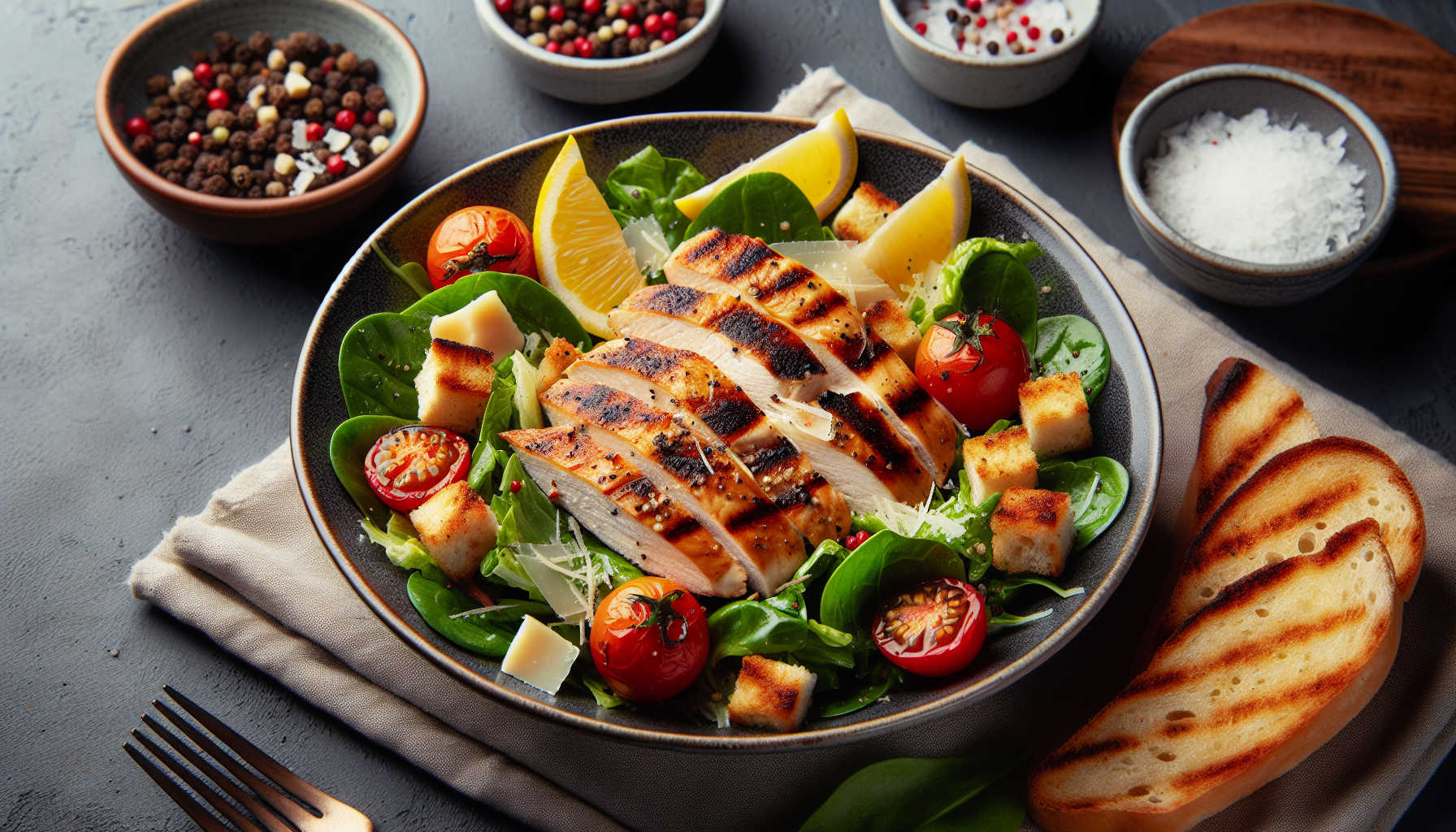 Această salată este compusă din piept de pui la grătar, copt perfect pentru a păstra suculența, crutoane crocante făcute din pâine puțin prăjită și asezonate cu ierburi aromatice, și parmezan ras, care adaugă o notă sărată și bogată. Complexează cu mix de salată verde, roșii cherry și o dressing bogat, dar totodată light, pe bază de ulei de măsline și lămâie.