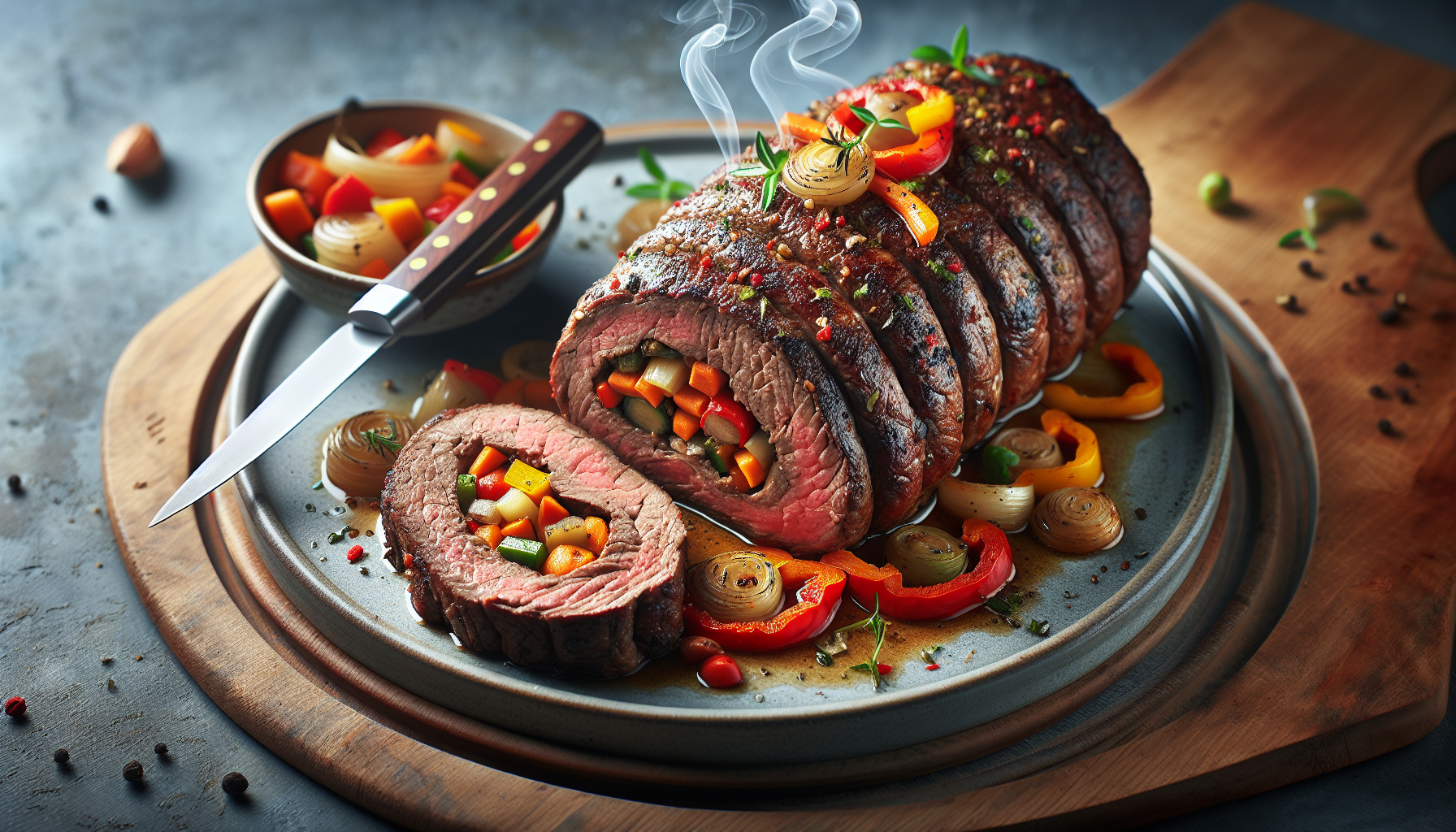 Rulada de vită umplută cu legume poate fi servită caldă sau la temperatura camerei. Este ideală atât pentru mesele de zi cu zi, cât și pentru ocazii speciale. Tăiați rulada în felii uniforme, având grijă să nu distrugeți umplutura. Puteți să o serviți alături de o garnitură de piure de cartofi, o salată proaspătă sau legume la grătar. Odelicata sos de roșii sau o glazură de muștar pot complementa perfect preparatul.
