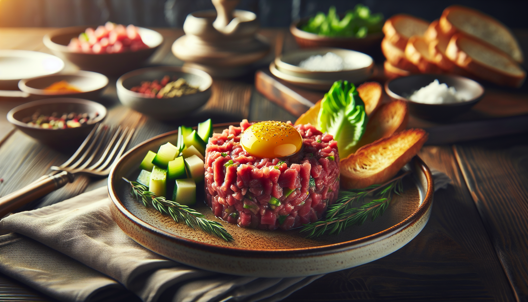 Tartarul de vită se servește de obicei pe o farfurie rece, iar prezentarea este esențială pentru a impresiona oaspeții. Puteți opta pentru un preparat minimalist, lăsând carnea să fie vedeta farfuriei sau să adăugați garnituri precum salată verde, rucola sau felii subțiri de castravete. De asemenea, pâinea prăjită sau crackers-urile sunt acompaniamente excelente, oferind un contrast textural plăcut. Unele persoane aleg să adauge gălbenuș de ou crud deasupra tartarului, pentru un aspect elegant și un plus de cremozitate.