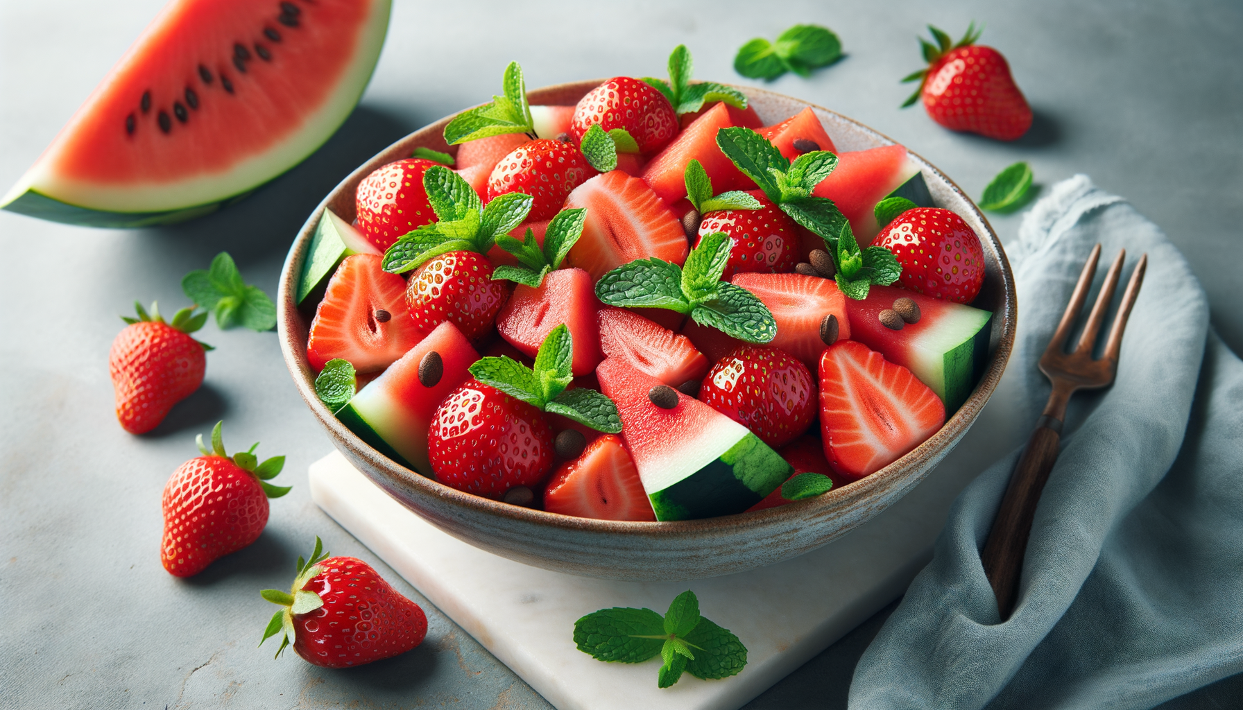 Combinația de căpșuni și pepene verde nu este doar delicioasă, ci și extrem de beneficiară pentru sănătate datorită conținutului ridicat de vitamine și antioxidanți. Pepenele verde este bogat în vitamina C și licopen, un antioxidant puternic, în timp ce căpșunile sunt o sursă excelentă de vitamina C și mangan. Frunzele de mentă adaugă nu doar aroma, ci și valori nutriționale precum fierul și vitamina A. Această salată este și un excelent detoxifiant, având proprietăți diuretice și hidratante.