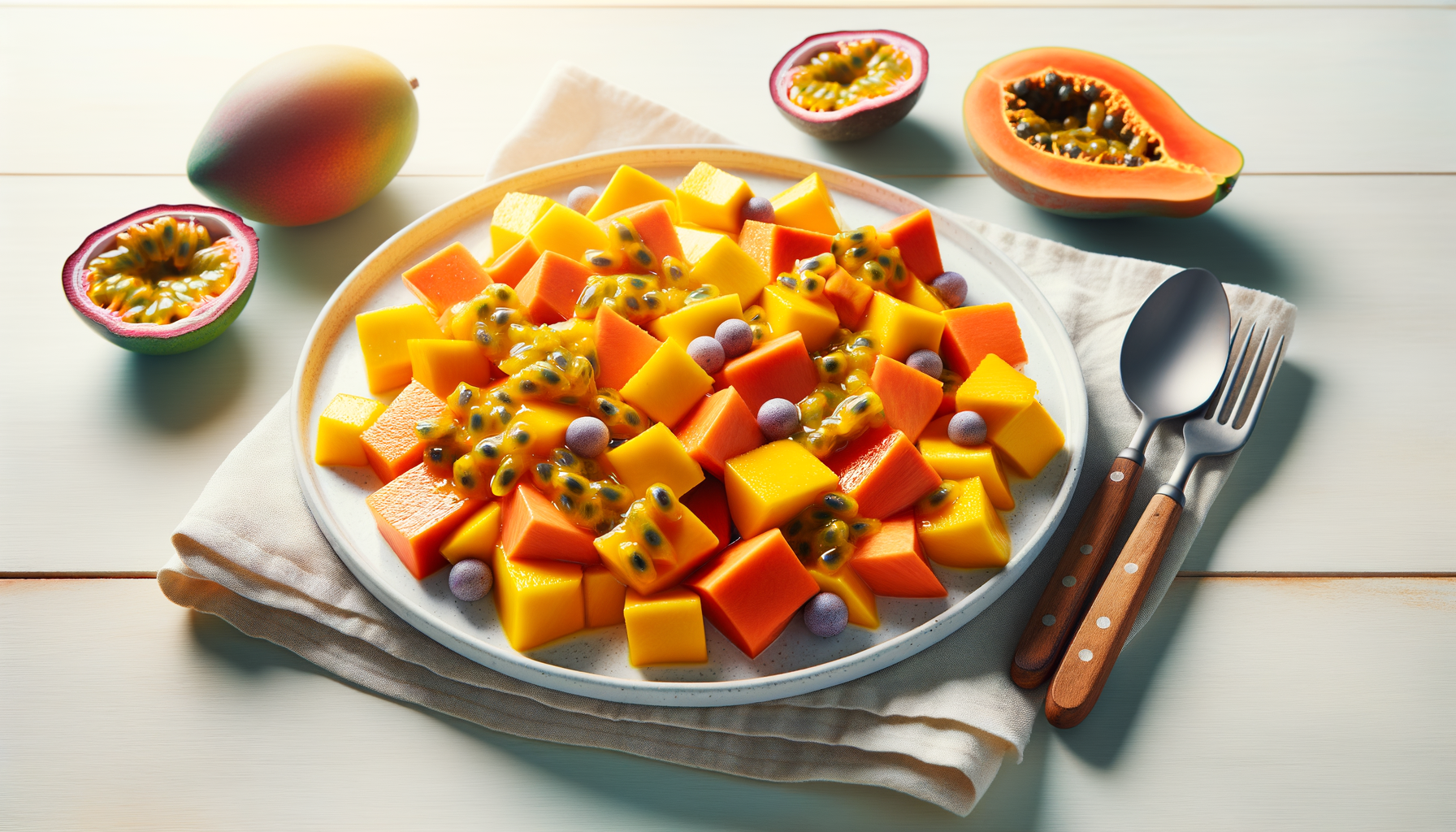 Beneficiile consumului acestei salate tropicala sunt multiple. Papaya este renumită pentru enzimele sale, precum papaina, care ajută la digestie și la descompunerea proteinelor. Mango este bogat în vitamina C și fibre, care promovează sănătatea sistemului imunitar și a sistemului digestiv. Fructul pasiunii conține vitaminele A și C, esențiale pentru sănătatea pielii și vederea. Împreună, aceste fructe oferă un boost de energie și hidratare, ideal pentru zilele calde de vară sau după activități fizice.