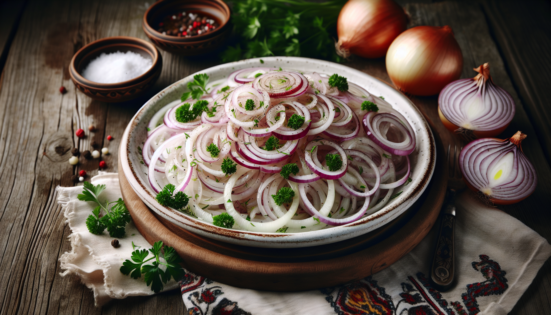 Calitatea finală a unei salate de ceapă depinde în mare măsură de prospețimea și calitatea ingredientelor. Când alegeți ceapa, este esențial să optați pentru exemplare care sunt tari și fără pete sau urme de deteriorare. Cepele mai mici tind să aibă un gust mai intens și o textură mai crocantă. Uleiul de măsline ar trebui să fie de calitate superioară, extravirgin, pentru a adăuga o aromă distinctă și un aport nutrițional dovedit. Alegerea oțetului și a muștarului depinde de preferințele personale; aceste ingrediente oferă un contrast acid și picant care echilibrează dulceața naturală a cepei. Pătrunjelul proaspăt adaugă nu doar un plus de culoare, dar și o aromă proaspătă și revigorantă, asigurând o experiență gustativă complexă.