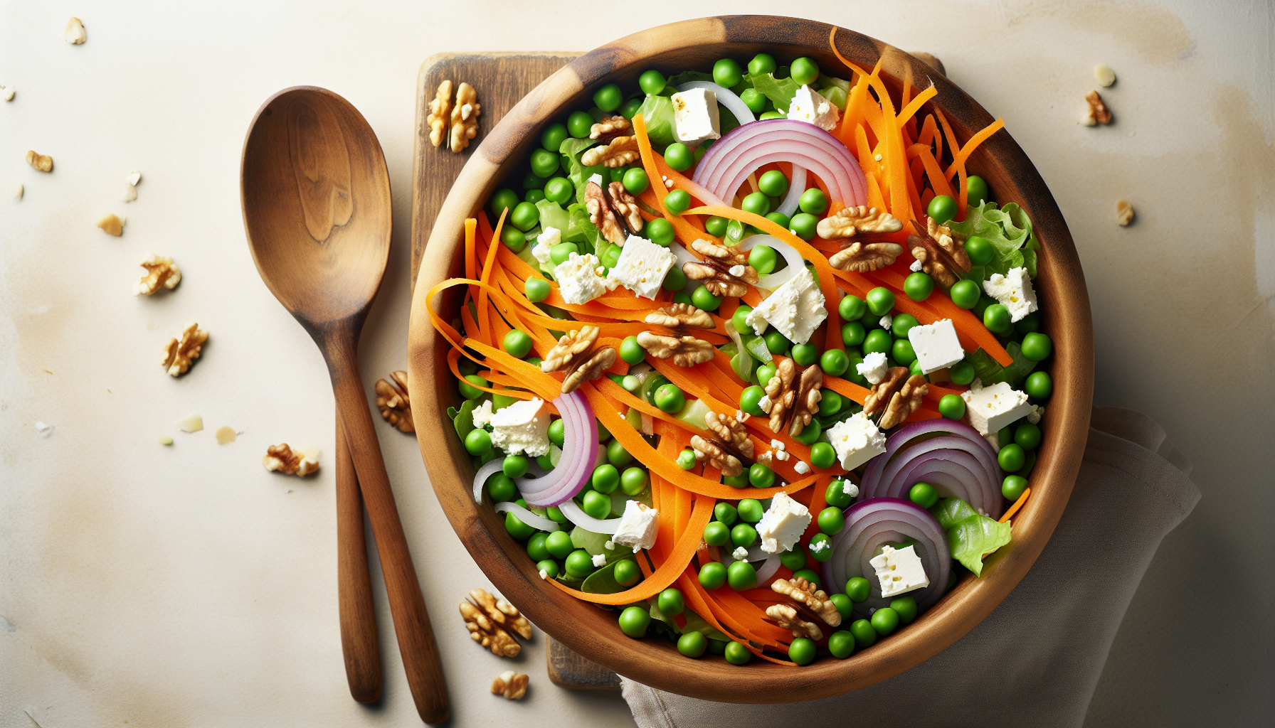 Odată ce mazărea este pregătită, scurgeți-o bine și lăsați-o să se răcească. Într-un bol mare de salată, combinați mazărea cu ceapa roșie tăiată fin și morcovii rași. Adăugați, dacă doriți, brânza feta și nucile tocate, amestecând ușor pentru a nu sfărâma ingredientele.