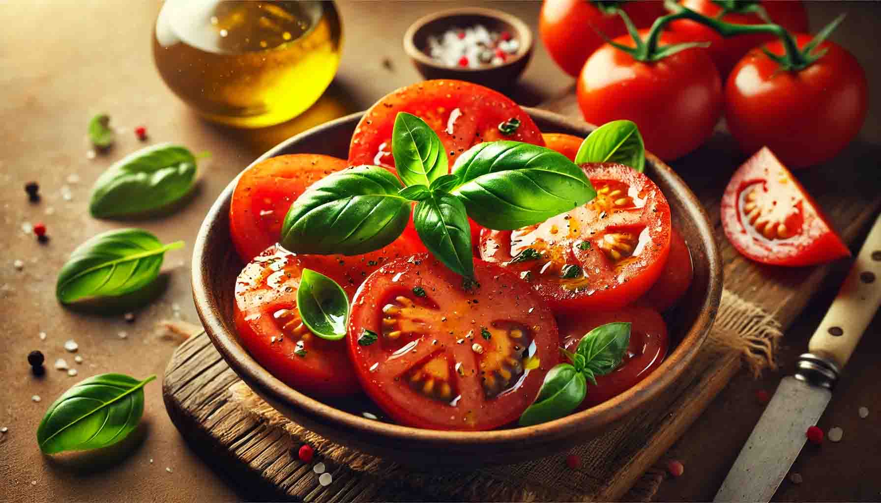 Aceasta salată este definită prin simplitatea și prospețimea ingredientelor sale. Rosiile zemoase, busuiocul aromatic și uleiul de măsline extra virgin sunt starurile acestui fel de mâncare. Textura crocantă a roșiilor proaspete completată de aroma intensă a busuiocului creează un echilibru perfect al gusturilor. Uleiul de măsline adaugă o notă de finețe și rotunjește profilul de arome, în timp ce un strop de oțet balsamic sau de lămâie poate accentua savoarea naturală a roșiilor.